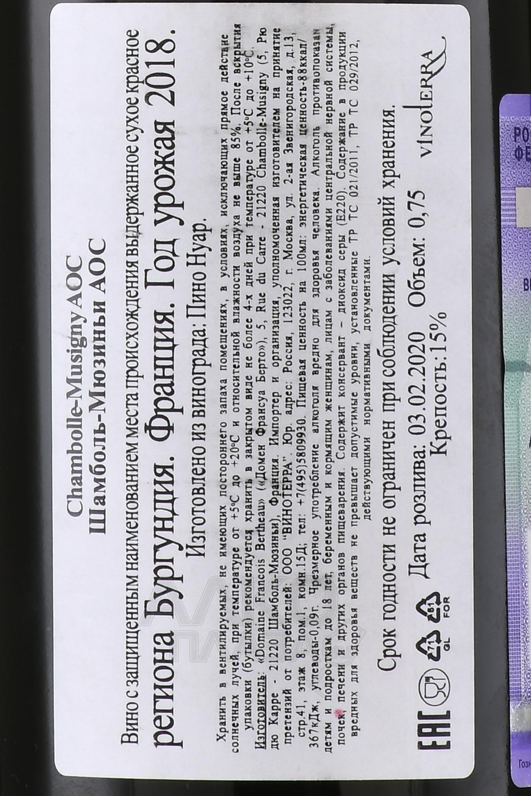 Красное сухое вино Domaine Francois Bertheau Chambolle-Musigny AOC 2018 0,75 л - изысканный и элегантный образец производимый семейным хозяйством в пятом поколении. Урожай собирают с собственных виноградников исключительно вручную с лоз средний возраст которых составляет 45 лет, далее тщательно сортируют и прессуют. Ферментация протекает в нейтральной среде. Выдержка проходила в бочках из французского дуба в течении 18 месяцев, после чего следует бутилирование и довыдержка в погребах винодельни. Теплое лето 2018 года с низким количеством осадков позволило получить максимально спелый урожай.