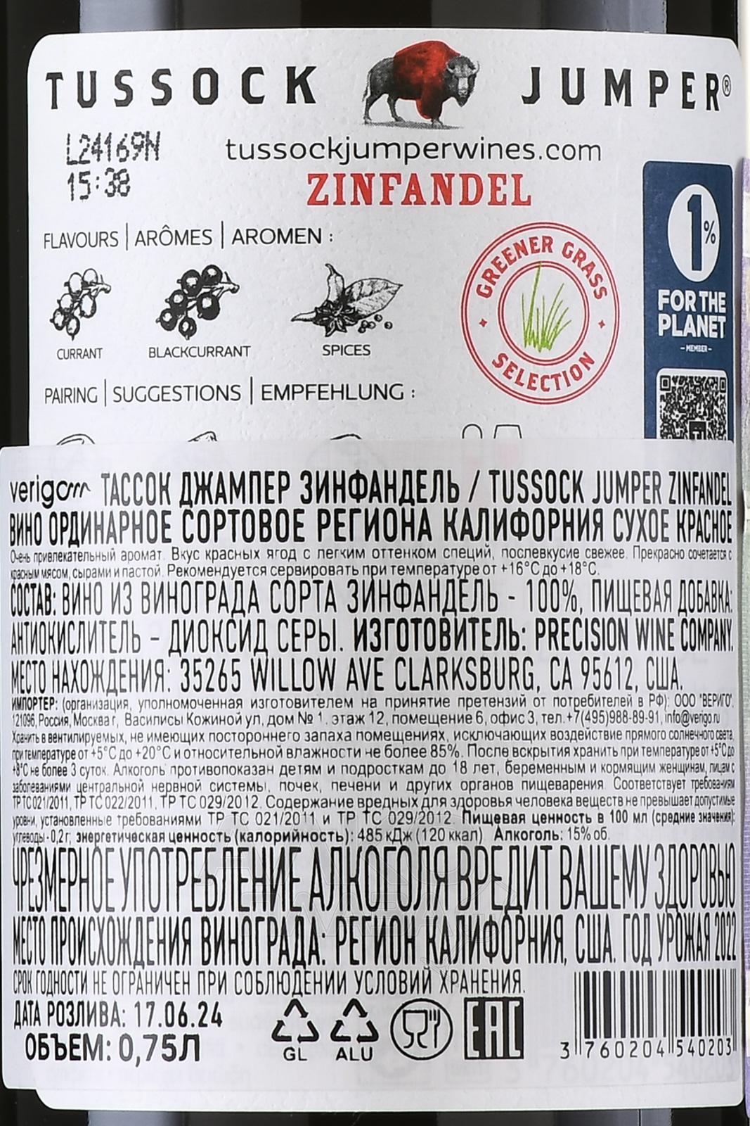 Вино Tussock Jumper Zinfandel – красный сухой сорт крепостью 13,5 градуса. Напиток приготовлен на основе винограда Зинфандель из калифорнийского региона Лоди, который является одним из главных винодельческих центров США. За классической процедурой винификации следует выдержка в старых дубовых барриках, которая обеспечивает благородный стиль напитка.