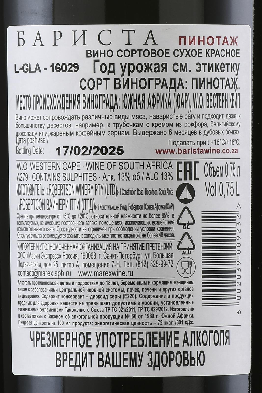Красное сухое вино Barista Pinotage 2021 г. 0,75 л, произведенное в Южно-Африканской Республике из сорта винограда, обозначенного в названии, относится к моносепажному типу и содержит исключительно ягоды ограниченного урожая. Часть из них была подвергнута так называемой флэш-пастеризации — обработке при высокой температуре, которая не повреждает сырье и позволяет сохранить ценные ароматические вещества. Кроме того, алкоголь сбраживался в дубовой таре с перекачкой сусла.