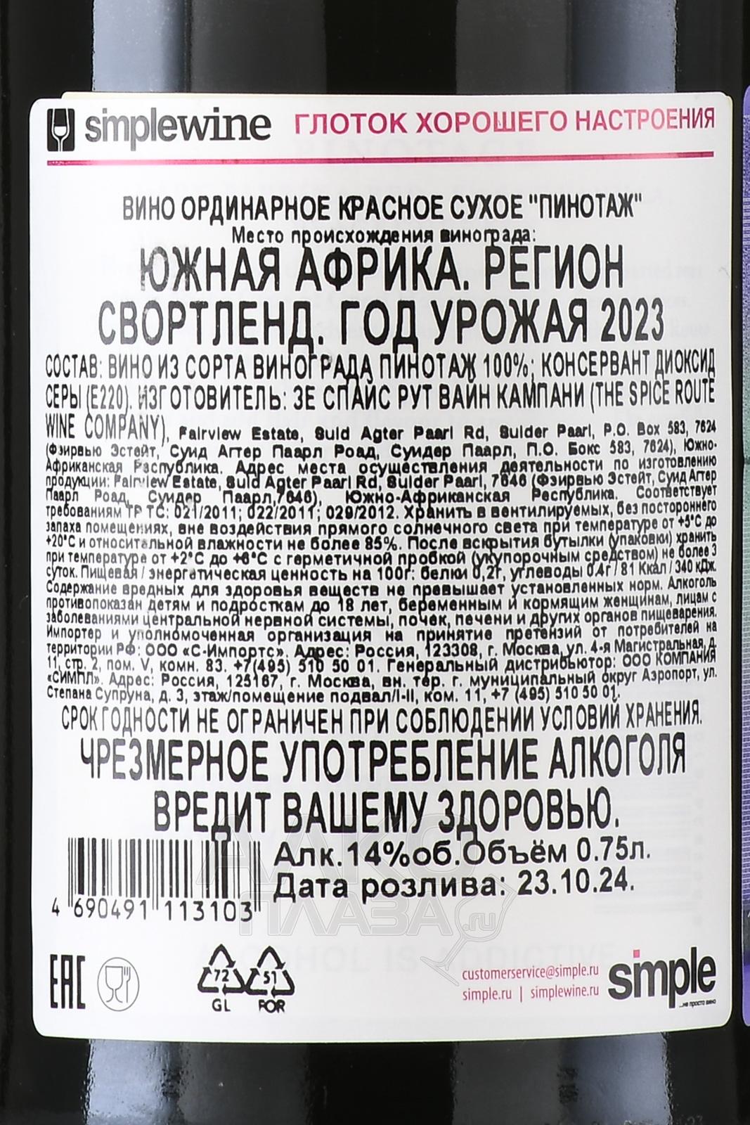 Вино Spice Route Pinotage красное сухое 0,75 л — напиток из одного сорта винограда, который выращивается в микрозоне элитного уровня Рибоксфонтейн. Это территория южноафриканского региона Свартланд. Плантация лозы располагается на уникальных почвах и обрабатывается без применения химикатов. Урожай, собранный ручным способом, ферментируют в 5-тонных стальных чанах. Вино выдерживается в бочках из американского дуба, из которых 40% новые, а остальные — вторичного наполнения.