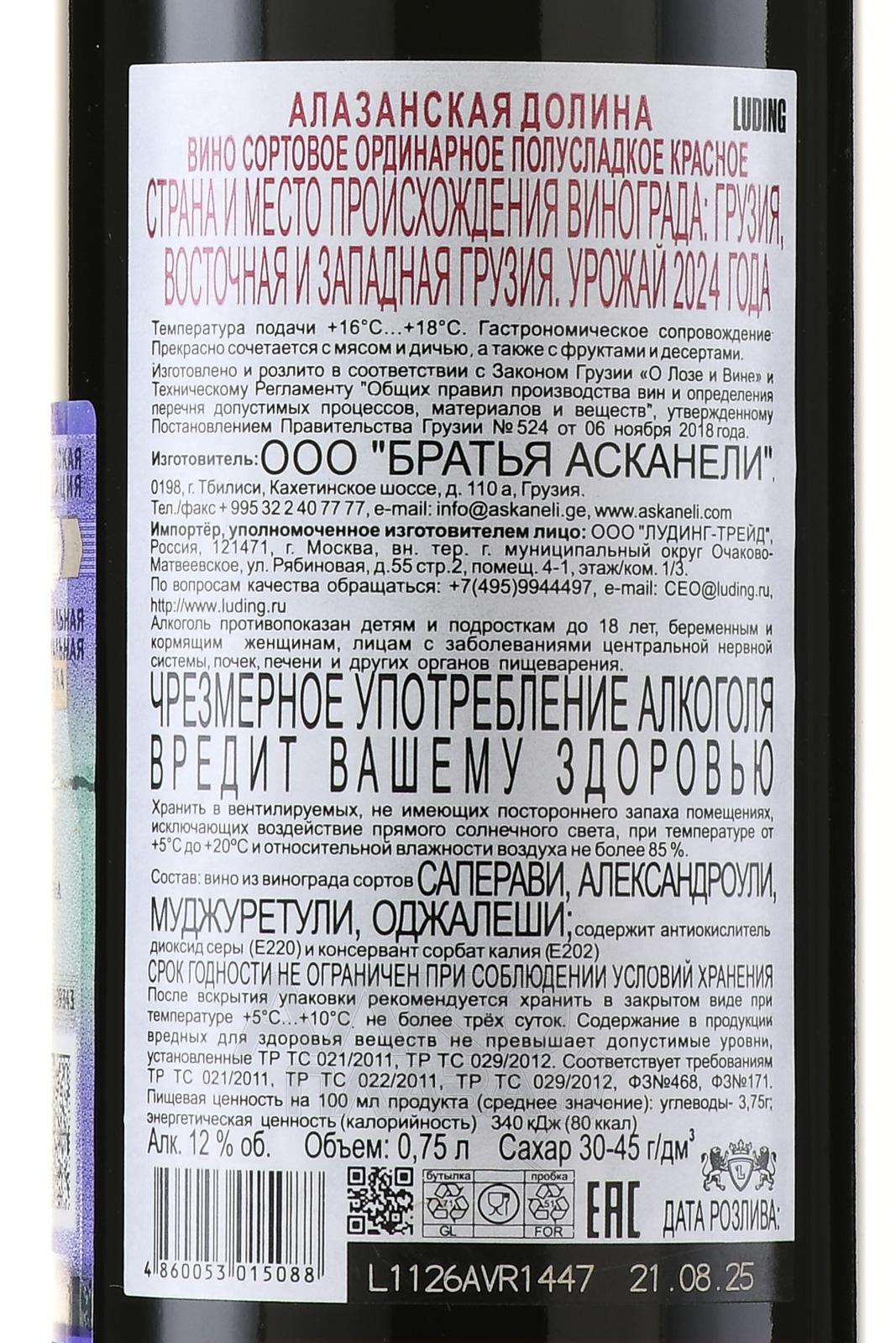Красное полусладкое вино Askaneli Alazany Valley 0.75 л создаётся из аборигенных сортов винограда. Ягоды, растущие в западной и восточной Грузии, дают напитку неповторимые качества. Отбирают самые спелые плоды, отделяют от гребней, все это проходит под чутким наблюдением специалистов компании. Приготовление вина проходит традиционным способом, выдерживают его в нержавеющих стальных чанах от 8 до 10 дней. В компании Братьев Асканели работают лучшие виноделы, каждое образец проходит контроль качества. Вино разливают в классическую стеклянную бутылку, крепостью 11-12%.
