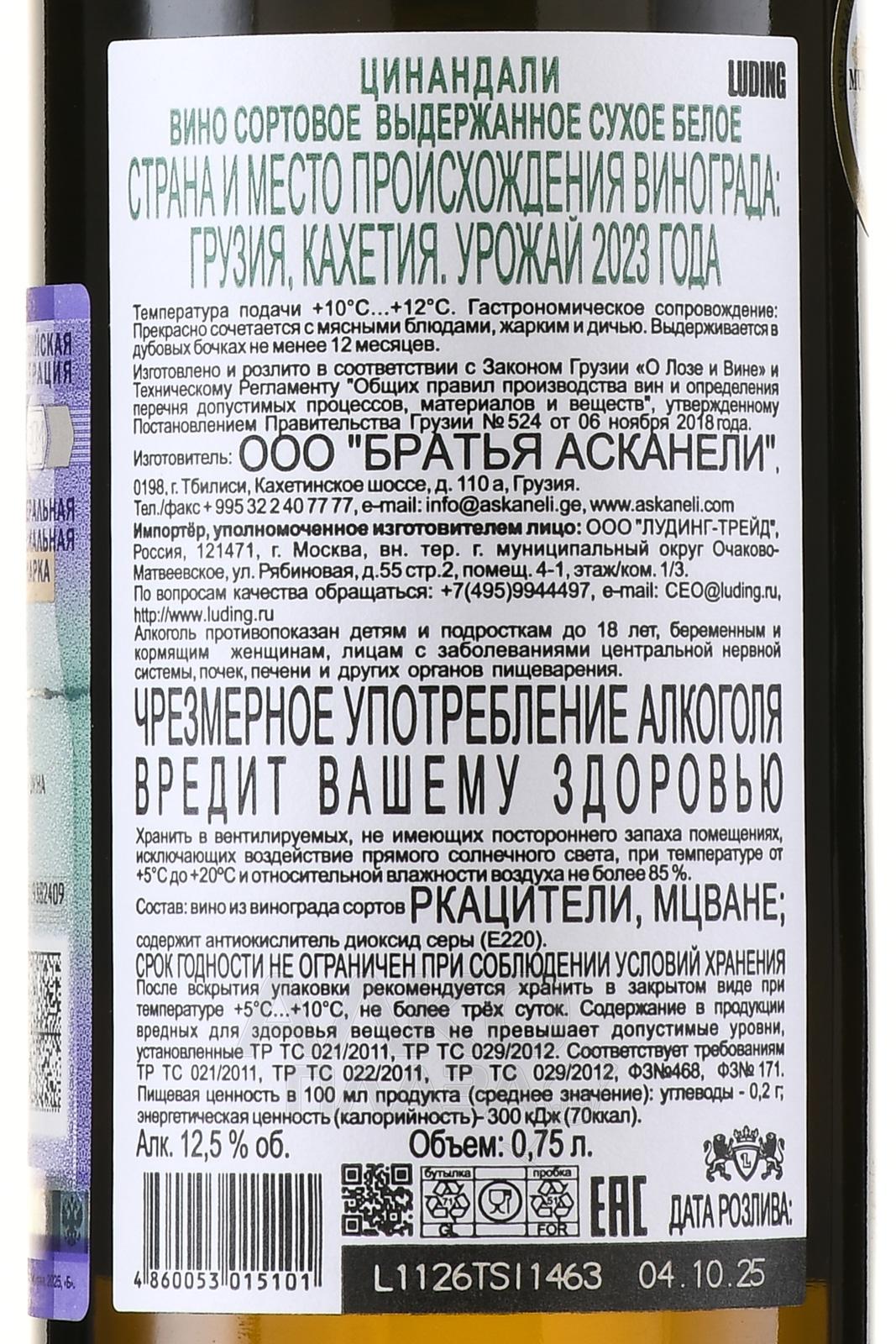 Белое сухое вино Askaneli Tsinandali 0.75 л изготавливается в Грузии из автохтонных сортов винограда Ркацители и Мцване. Напиток выдерживают в деревянных чанах не меньше двух лет, в связи с этим оно приобретает изысканный вкус зеленого яблока и лимона, а также фруктово-ягодный аромат. Вино создается по четко контролируемому методу, разработанному в XIX веке Александром Чавчавадзе — знаменитым виноделом, поэтом и общественным деятелем. Данное вино получило золотую награду во время дегустации на конкурсе «Северная столица». Напиток разливают в классическую стеклянную бутылку, крепостью 13%.