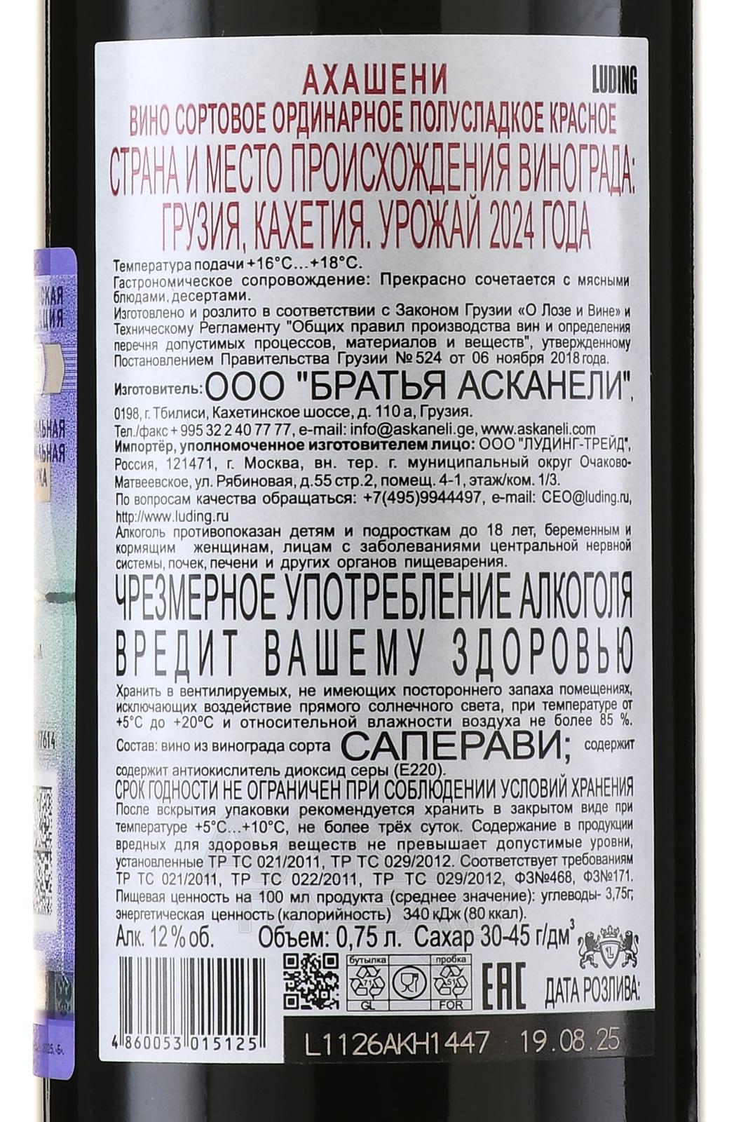 Красное полусладкое вино Askaneli Akhasheni 0.75 л - нежный, элегантный моносортовой напиток, созданный из автохтонного сорта Саперави, выращенного на виноградниках в микрозоне Ахашени, в Кахетии. Урожай собирают обычно в начале сентября или конце октября. На заводе плоды внимательно перебирают, отделяют от гребней и аккуратно прессуют. Сбраживание протекает в чанах из нержавеющей стали при четко отслеживаемой температуре 25-28 градусов около 8-12 дней, под контролем специалистов компании. Здесь работают лучшие грузинские виноделы, использующие новейшие технологии. Напиток разливают в темную бутылку с коричневой этикеткой, крепостью 12%.