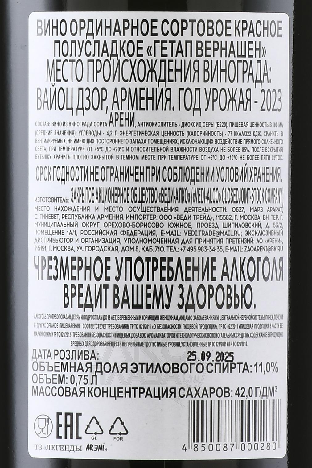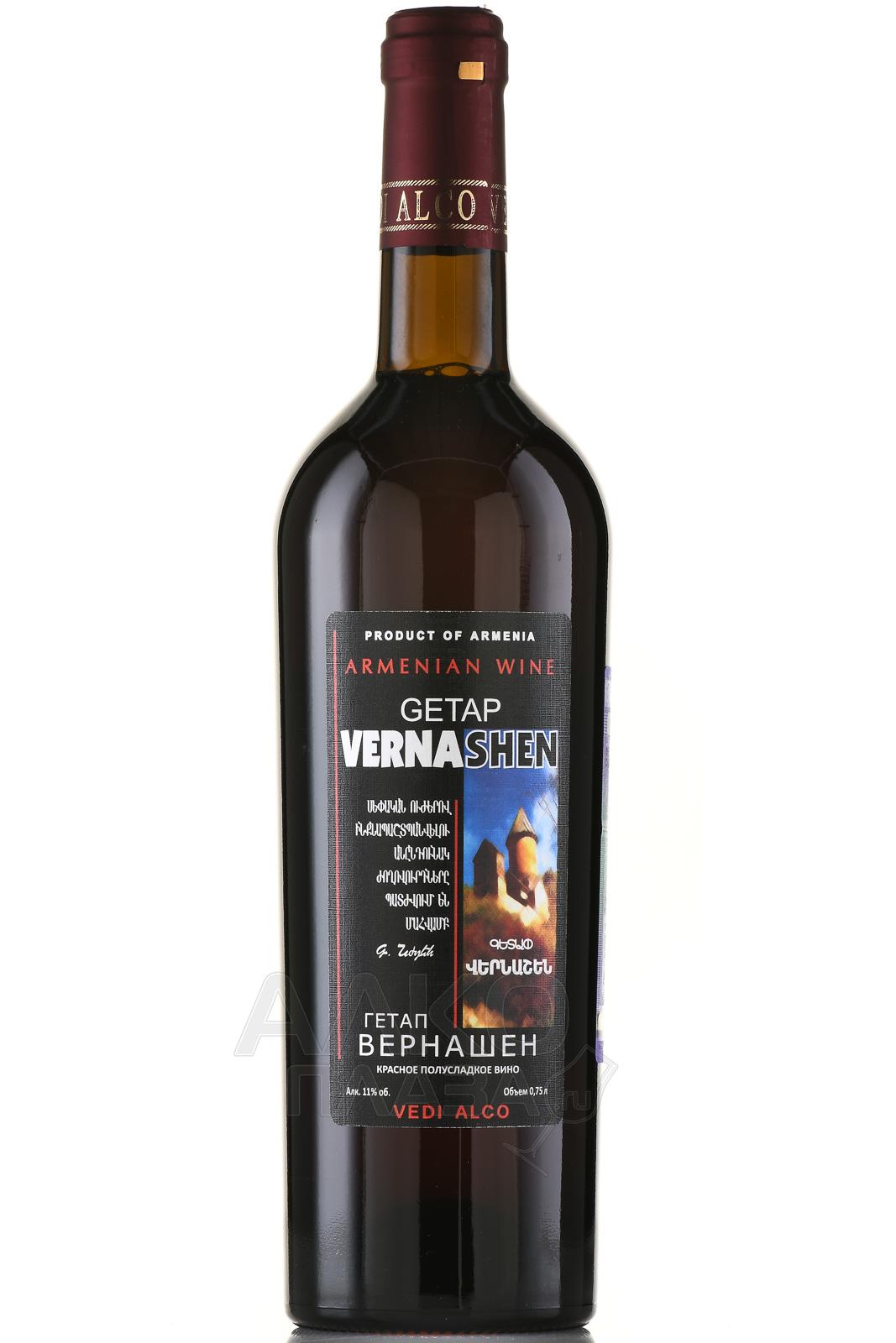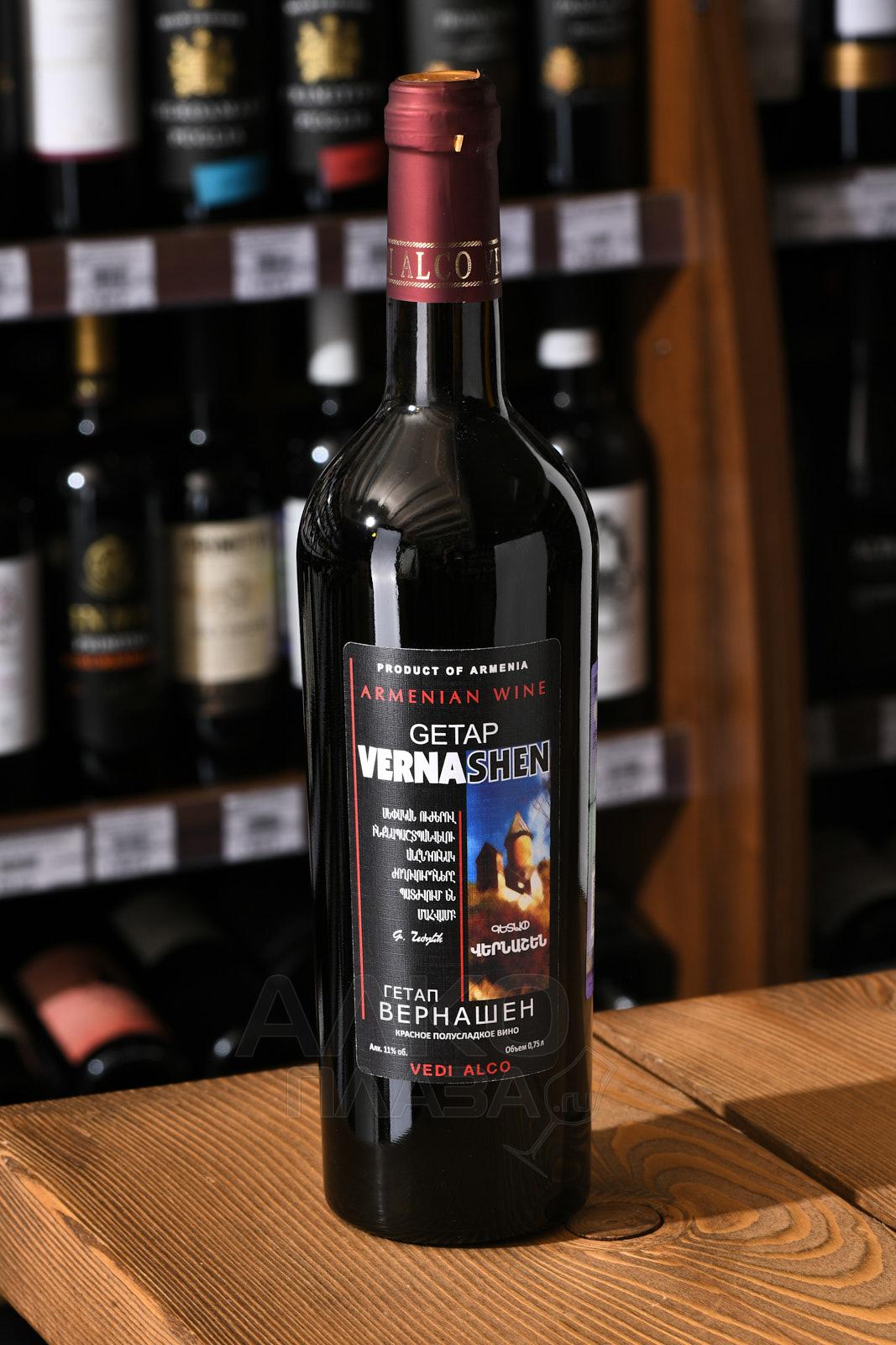 Красное полусладкое вино Getap Vernashen 0,75 л — популярная армянская разновидность, состоящая из спелых ягод Арени. Их вырастили в теплом климате Вайоцдзорской области и собрали в 2020 году. Производство напитка осуществилось на классическом оборудовании путем ферментации, которую остановили резким понижением температуры, когда сладость вина достигла отметки 42 г/л. Перед розливом по бутылкам его слегка отфильтровали.