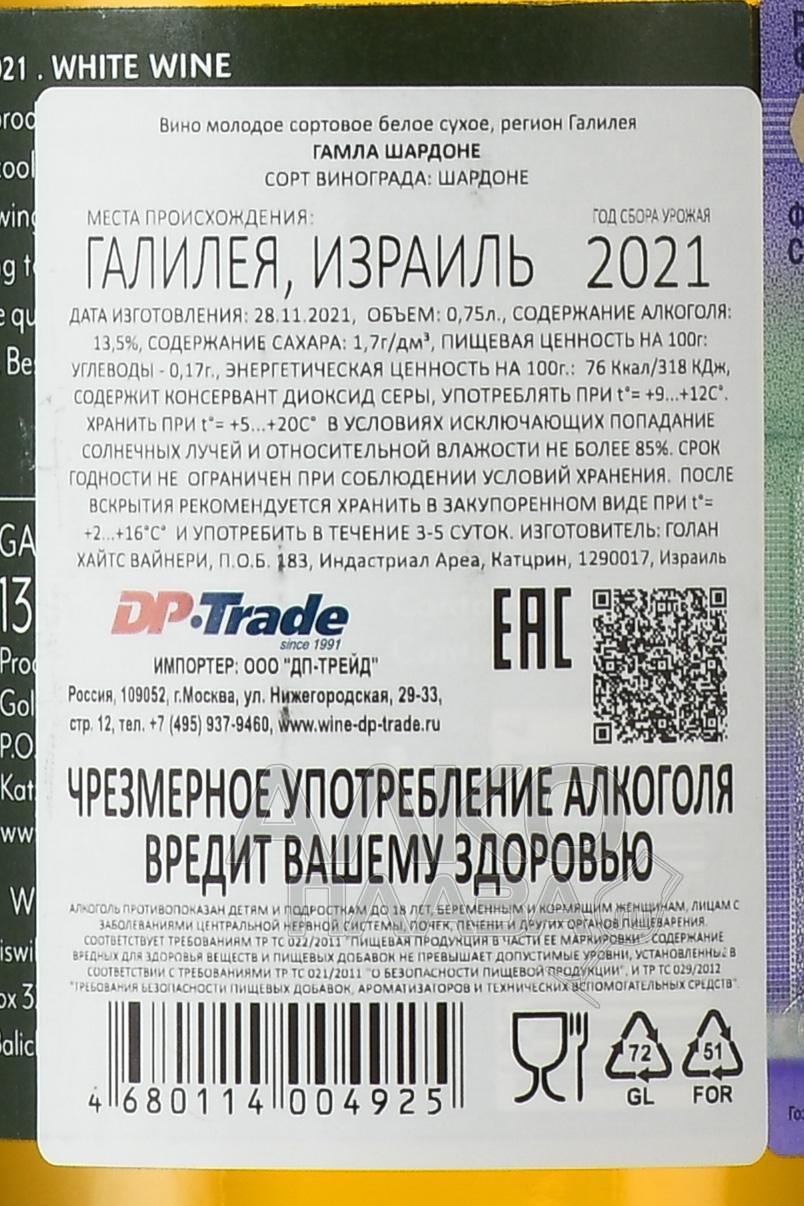 Белое сухое вино Gamla Chardonnay 0,75 л — кошерный алкогольный напиток гарантированно высокого качества, присутствующий в линейке спиртного с насыщенно-фруктовой дегустационной палитрой. Виноград, выбранный для изготовления вариации, собрали в северном регионе Израиля — на просторах Голанских Высот. Подготовленное сусло сбраживали в нейтральных резервуарах из нержавеющей стали и выдерживали в дубовых барриках французского происхождения около четырех месяцев. Вино приятно употреблять молодым — в первые 4 года после бутилирования (розлив по бутылкам осуществился поздней осенью 2021 года).