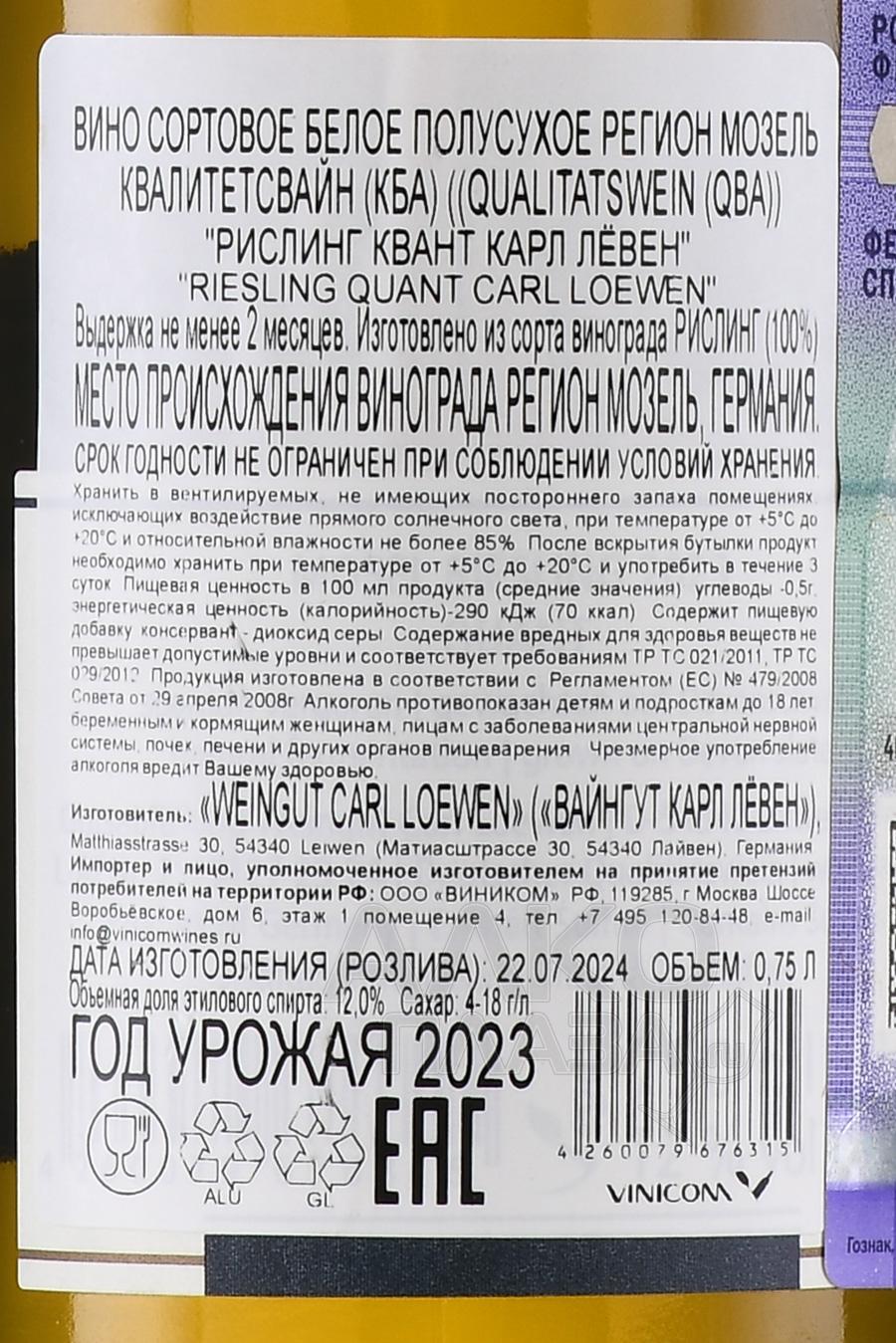 Carl Loewen Riesling Quant - вино Карл Лёвен Рислинг Квант 0.75 л белое полусухое