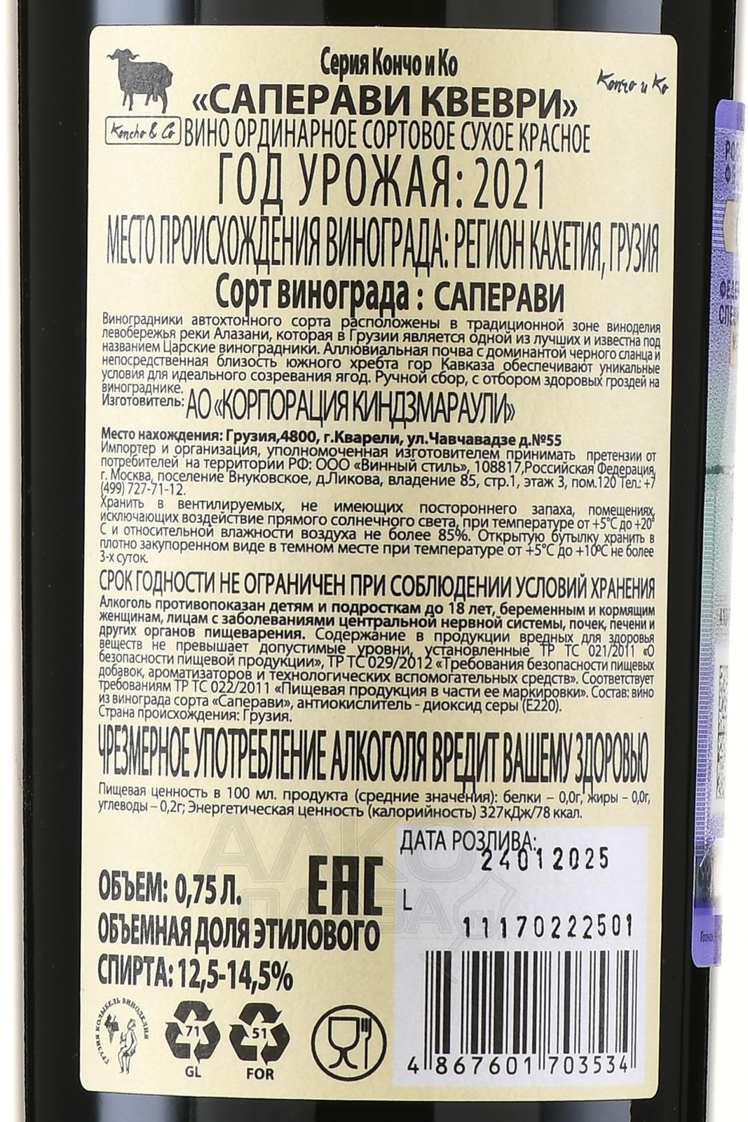 Красное сухое вино Саперави Кварели Chateau Kvareli 0.75 л произведено из автохтона Саперави, выращенного в регионе Кахетии. Так как виноградники произрастают на почве с доминированием черного сланца и непосредственной близостью к южному хребту гор Кавказа, создаются уникальные условия для выращивания лоз. Плоды созревают медленно, наполняясь всеми необходимыми свойствами. Напиток изготавливают традиционным методом с ферментацией на мезге. Благодаря такому способу, вино получает сильный и неповторимый вкус.