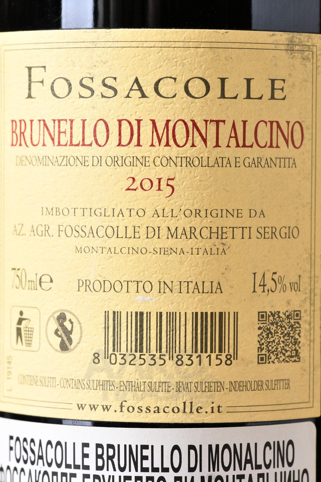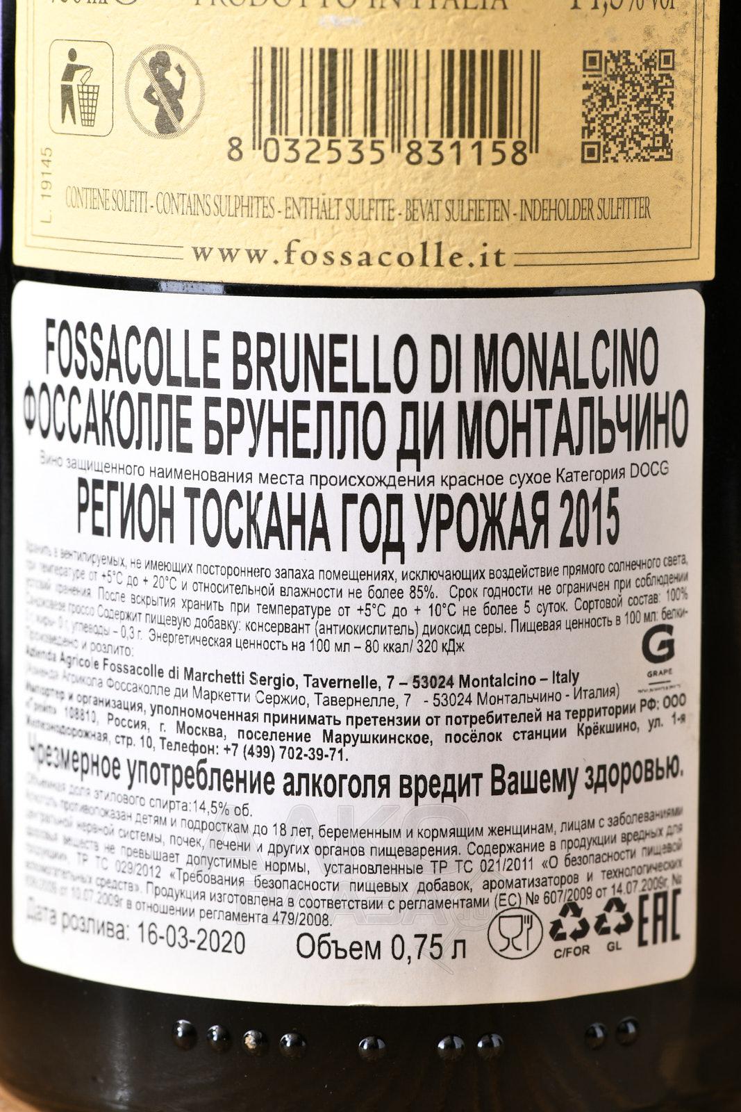 Красное сухое вино Fossacolle Brunello di Montalcino 2014 г находится на самой высокой ступени классификации итальянского спиртного из ферментированного винограда, так как представлено в категории DOCG. Элитный продукт крепостью 14,5% от известного у себя на родине семейного предприятия был произведен в 2015 году в Тоскане, коммуне Монтальчино, из свежего урожая винограда Sangiovese Grosso. Сырье — спелые ягоды — собрали вручную и подвергли окислению в чанах из стали и бетона, а также спиртовому брожению сроком 24 дня при 30-32 °C. Для максимальной экстракции и формирования яркого букета был применен делестаж. Часть сусла выдерживалась в бочонках повторного наполнения, оставшееся вино — в новых бочонках французского и славонского происхождения. Продукт поставляется нефильтрованным, поэтому в бутылке допускается небольшой осадок. Винтаж отличается внушительным потенциалом к хранению — порядка 20 лет.
