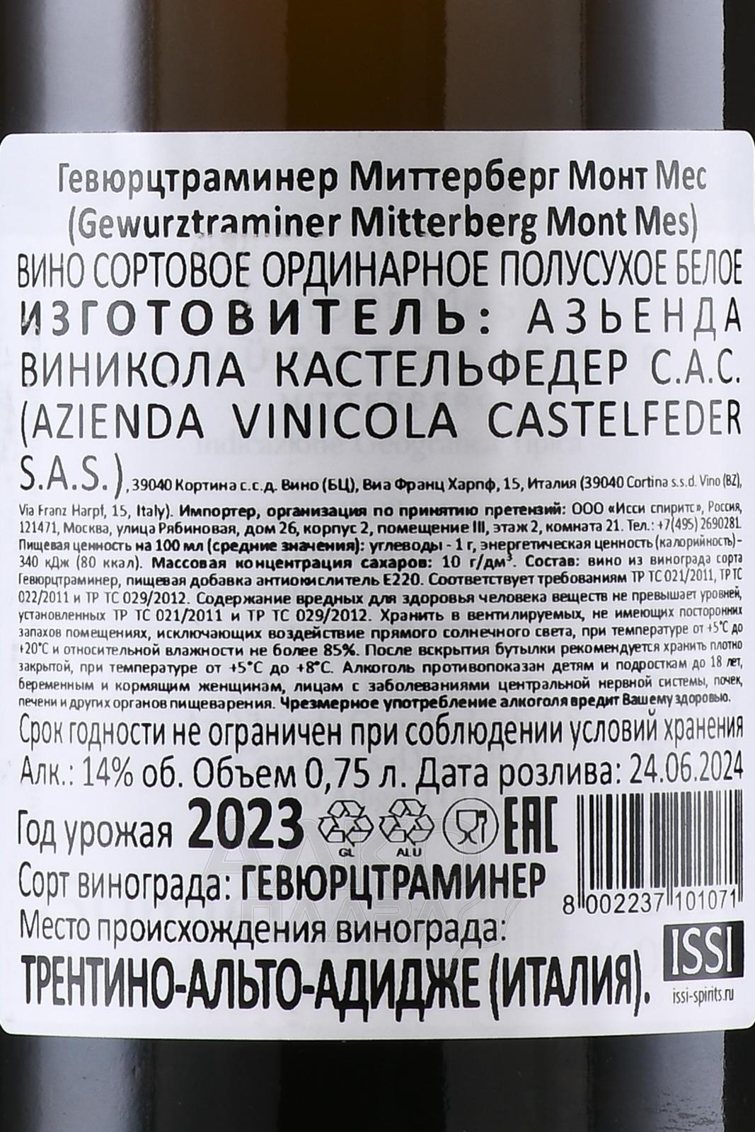 Castelfeder Mont Mes Gewurztraminer - вино Кастельфедер Монт Мес Гевюрцтраминер 0.75 л белое полусухое