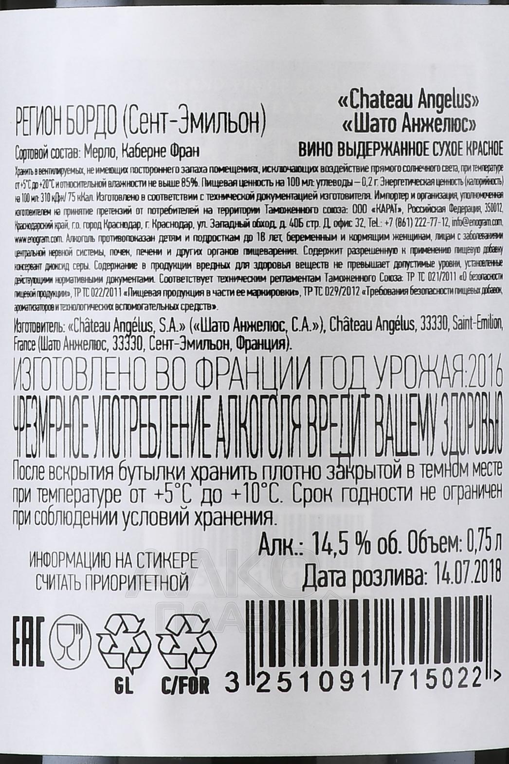 Chateau Angelus Saint-Emilion AOC 1-er Grand Cru Classe 0,75 л – красное сухое вино, получившее высшие оценки от мировых критиков и экспертов. Оно создано из купажа бордоских сортов винограда, ягоды которых собраны в угодьях поместья Анжелюс в Сент-Эмильоне, имеющих самый высокий статус из возможных – Премьер Гран Крю. Винификация проходит в резервуарах из бетона, дерева и нержавеющей стали, куда виноградный сок и сусло перетекают под действием силы тяжести. После окончания процесса брожения вино разливается в новые дубовые бочки, где выдерживается 1,5-2 года. Напиток имеет высокую ценность для коллекционеров – наиболее ярко он раскрывает свой вкус через 15-20 лет после сбора урожая. Максимальный срок хранения спиртного в бутылке составляет 30 лет.