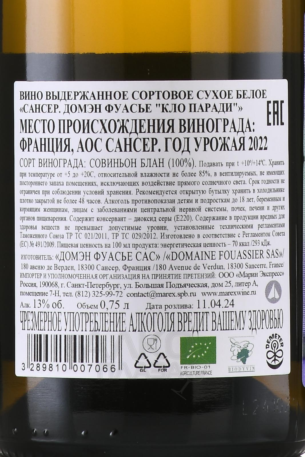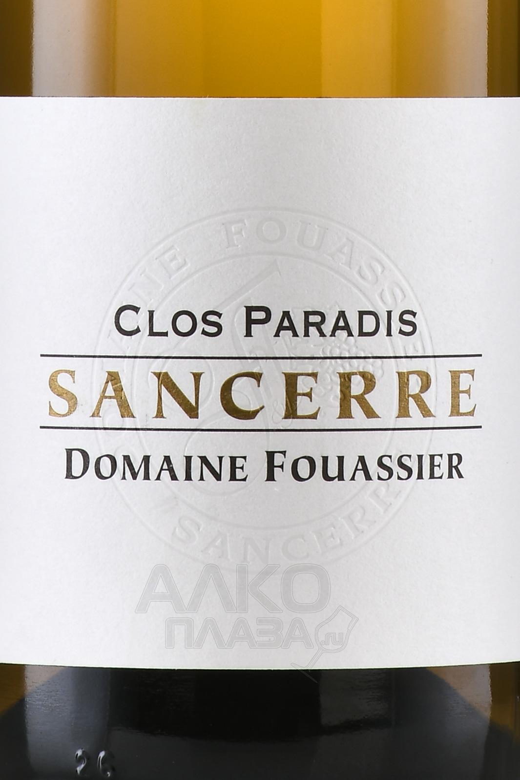 Domaine Fouassier Sancerre Clos Paradis - вино Домэн Фуасье Сансер Кло Паради 0.75 л белое сухое