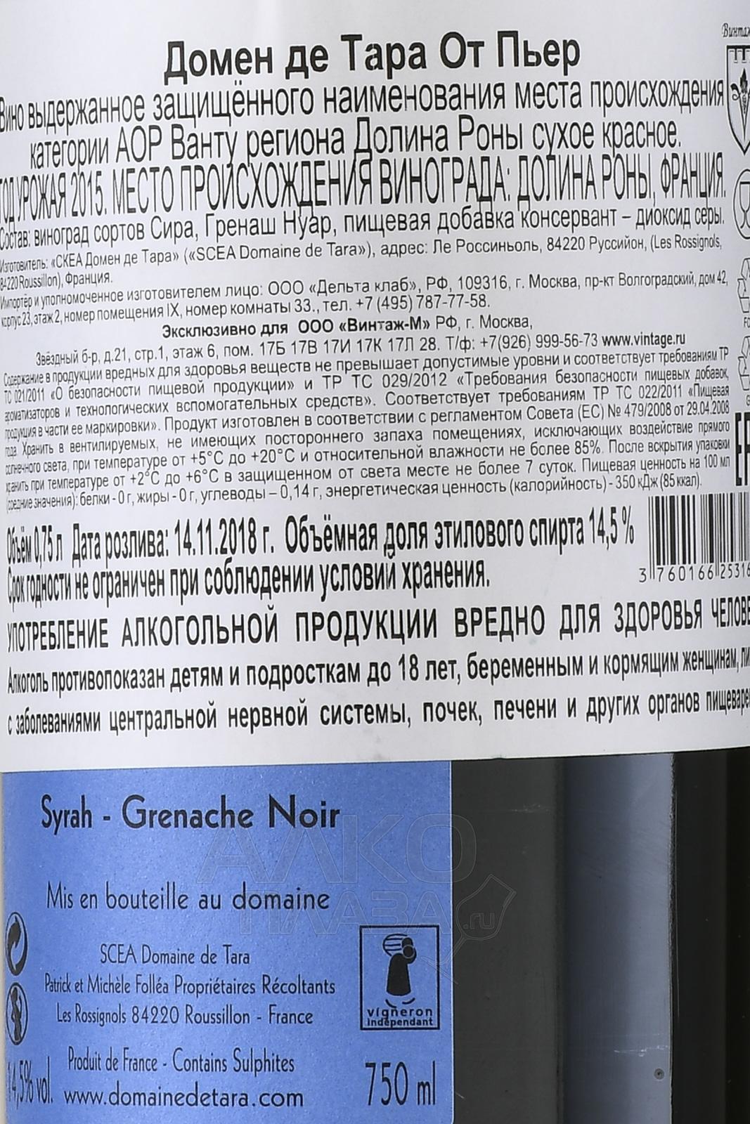 / Domaine de Tara Сайт alcoplaza.ru содержит информацию, не рекомендованную для лиц, которые не достигли возраста 18 лет. Чтобы осуществить вход на сайт, Вам необходимо подтвердить свой совершеннолетний возраст. Сведения, размещенные на сайте , не являются рекламой, носят исключительно информационный характер, и предназначены только для личного использования. Информация на сайте не является публичной офертой.