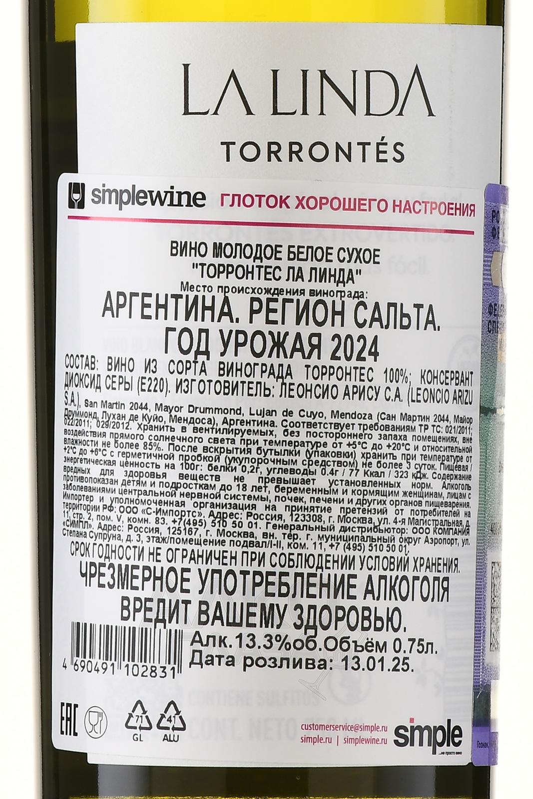 Finca La Linda Torrontes 0,75 л – винтажное белое сухое вино из винограда, популярного в Аргентине. Плоды, идущие на изготовление напитка, собирают на высоте 1700 метров над уровнем моря на участках провинции Сальта в регионе Мендоса. Лозы характеризуются средним возрастом 30 лет. На винодельне ягоды сортируют и прессуют. Очищенный от мезги сок выдерживают в стали в течение 24-48 часов, после чего отправляют на сбраживание в термоконтролируемых ферментерах при 15 °С. В завершение напиток подвергается мягкой фильтрации и разливается по бутылкам.