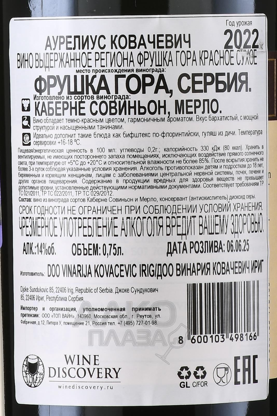 Красное сухое вино Aurelius Kovacevic 0,75 л создано в сербском регионе Фрушка Гора, где виноград растет на холмах с известняковыми и вулканическими почвами, формирующими плотную структуру ягод. Местный климат сочетает теплое лето и прохладные ночи, поэтому плоды набирают сахар равномерно, сохраняя стабильную кислотность. Также в процессе созревания они приобретают яркую ароматику благодаря низкой урожайности на виноградниках. Производитель использует ручной сбор и тщательную сортировку, после чего сусло ферментируют при контролируемой температуре. Выдержка в дубе и стали придает напитку сбалансированный и многогранный стиль.