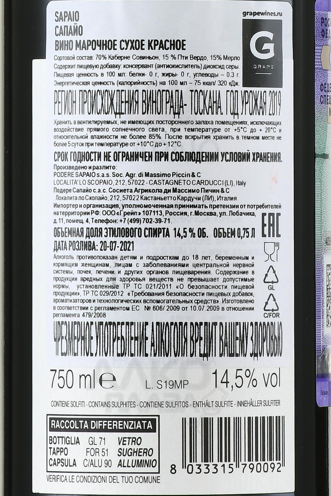 Красное сухое вино Podere Sapaio Sapaio Bolgheri Superiore 2015 г из итальянского субрегиона Болгери (Тоскана) состоит из четырех вариаций винограда с преобладанием ягод Cabernet Sauvignon. Напиток крепостью 14,5% изготовлен по технологии сбраживания в стальных чанах с постоянным контролем температурных значений. Вино полтора года вызревало в дубовых бочках и дополнительно выдерживалось в бутылках 8-10 месяцев.