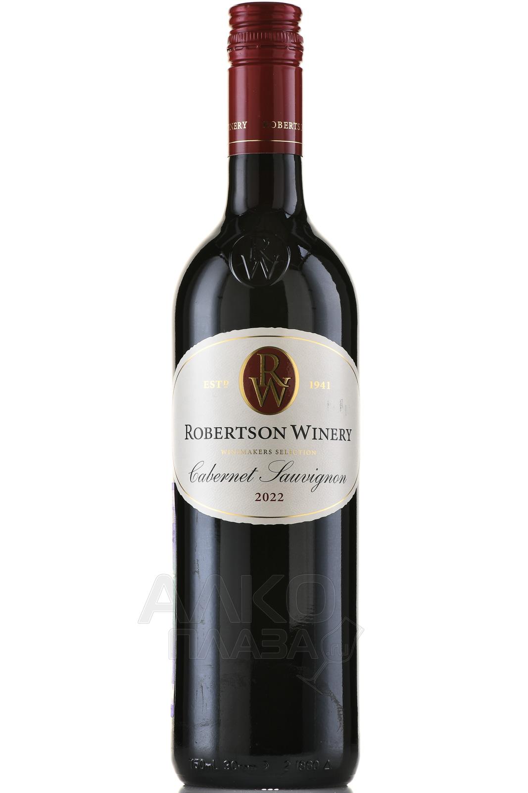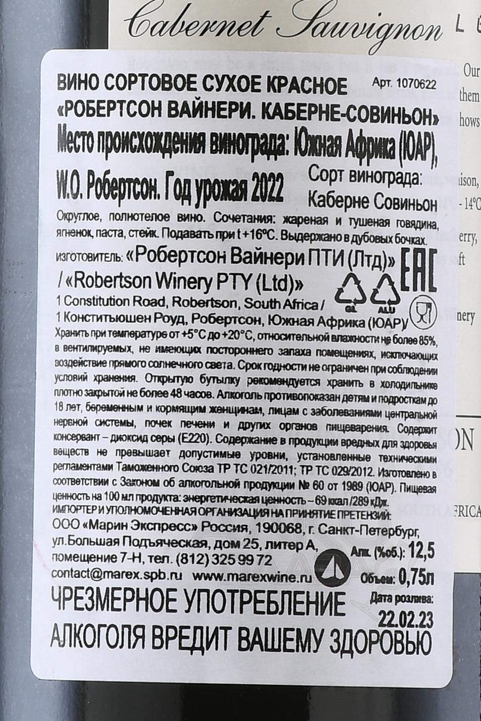 Красное сухое вино Robertson Winery Cabernet Sauvignon 0,75 л изготовлено из одного сорта винограда. Урожай собрали с разных участков долины Робертсон в Западном Кейпе. Ягоды созрели в засушливых условиях на почвах, богатых известняком. Сбор плодов прошел рано утром в феврале и марте. После 4-дневной ферментации при температуре 28 °С спиртное разлили в бочки из французского дуба, где оно было выдержано в течение четырех месяцев. Вино рекомендуется употребить в течение первых 2-3 лет со дня розлива.