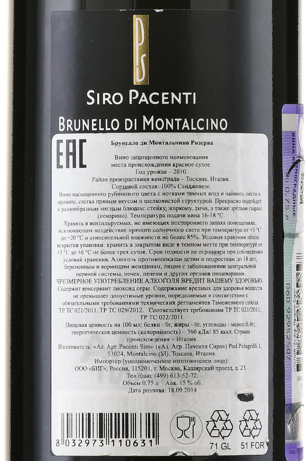 Siro Pacenti Brunello Di Montalcino Riserva - вино Сиро Паченти Брунелло Ди Монтальчино Ризерва 0.75 л красное сухое