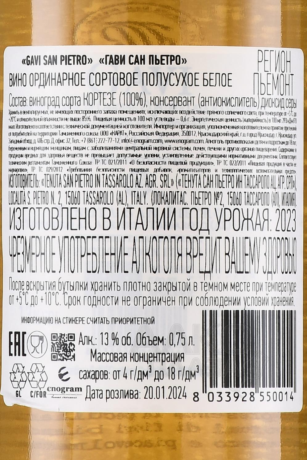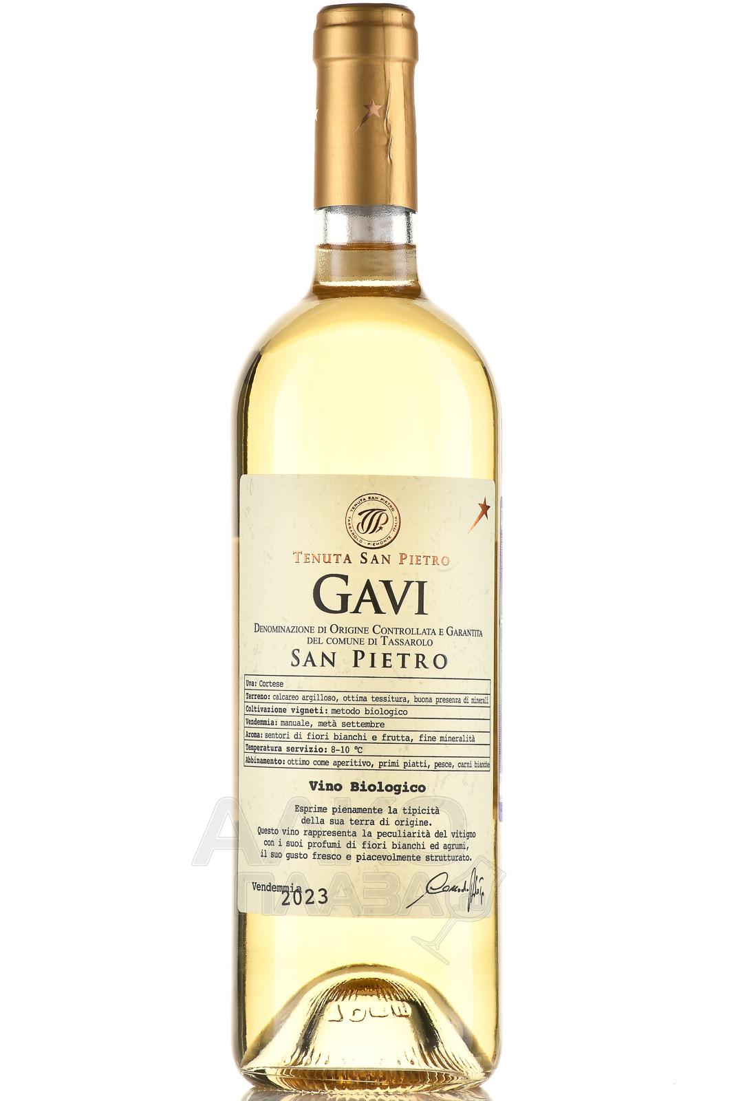 Белое полусухое вино Tenuta San Pietro Gavi 0,75 л производится из ягод, собранных ручным способом на этапе оптимальной спелости. Для культивирования виноградников используются техники органического виноделия. Полученный урожай сортируют и отжимают, после чего происходит алкогольное брожение в стальных терморегулируемых емкостях. Перед розливом готовое вино созревает на осадке в течение минимум 2 месяцев.