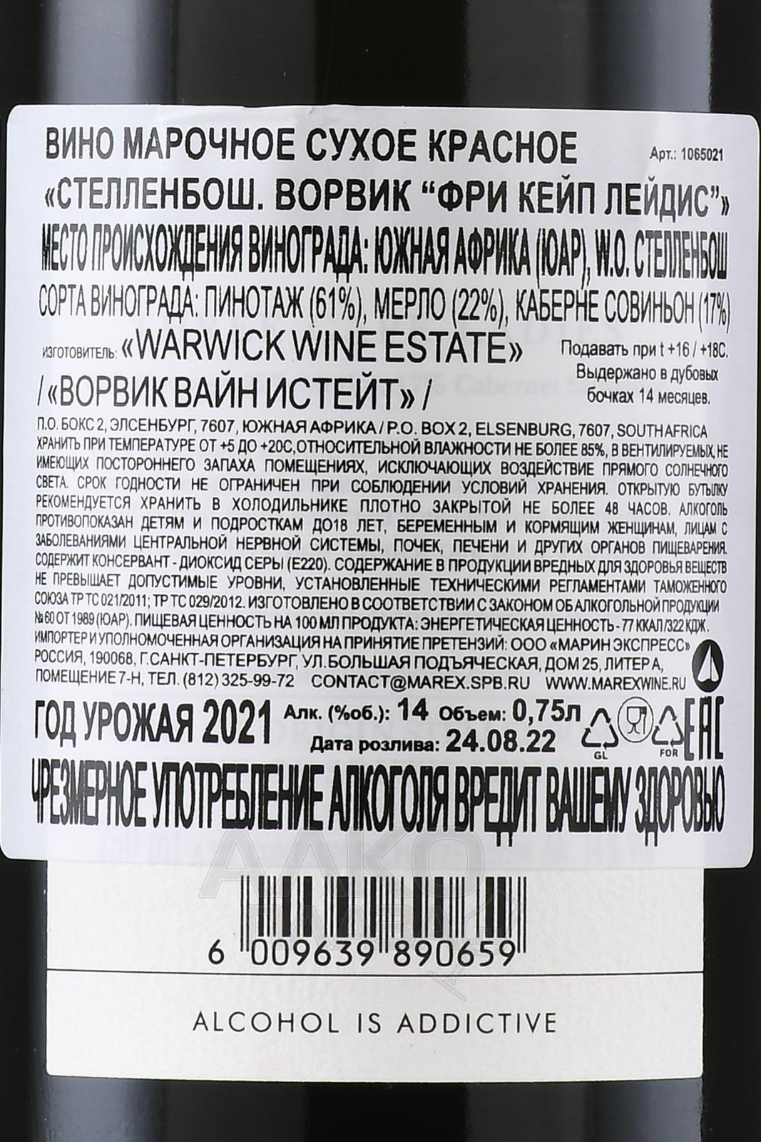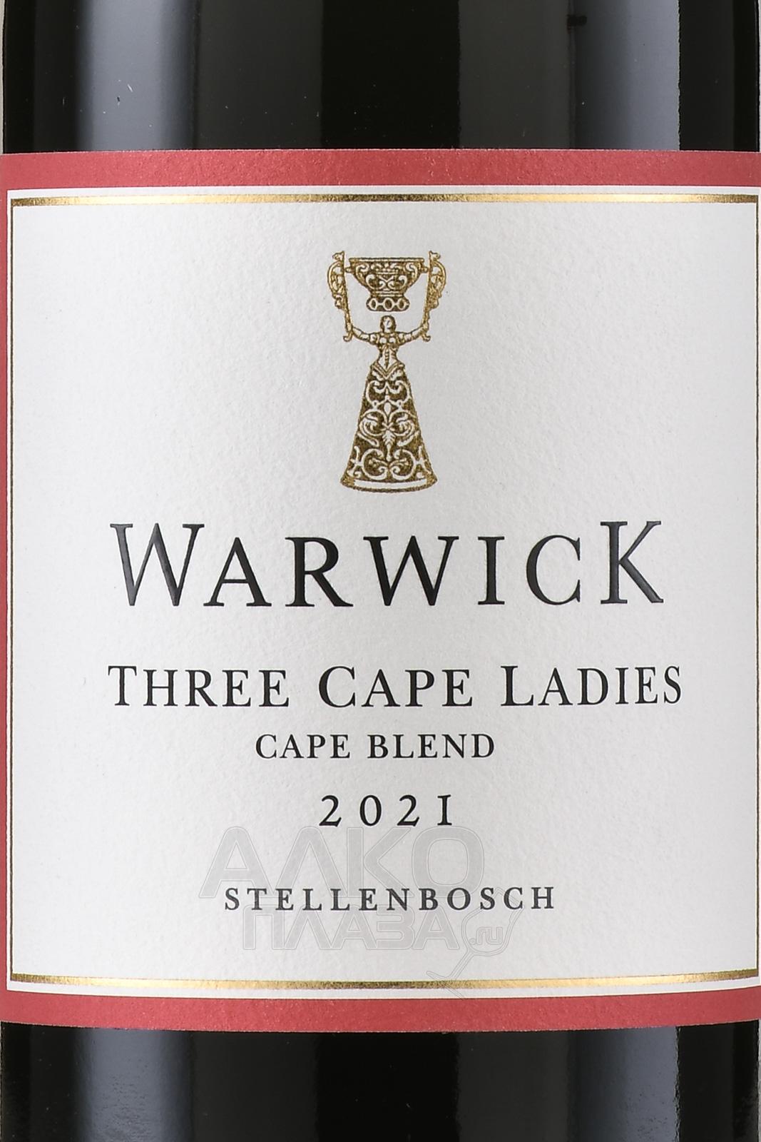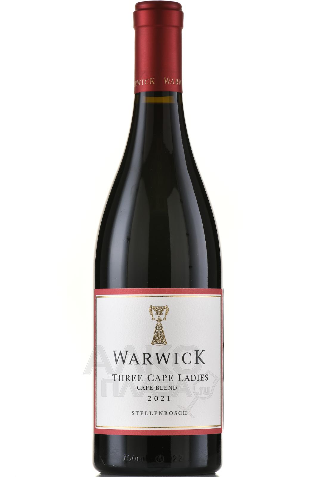 Вино Warwick Estate Three Cape Ladies 0,75 л — купажированный напиток из 4-х красных сортов винограда, выращенных в уникальном терруаре субрегиона Стелленбош. Название переводится как «Три леди Кейпа» и является отсылкой к истории виноделия Западного Кейпа: первой местной женщиной-виноделом стала Норма Ратклифф, ее дело продолжили дочь Дженни и внучка Ева. Для создания вина используется сырье, собранное вручную в утренние часы. Напиток выдерживается на протяжении 18 месяцев в дубовых бочках, а затем дозревает в бутылках. Потенциал его хранения в стекле составляет 8-10 лет. Данный купаж приобрел широкую известность после того, как появился в одном из фильмов о Джеймсе Бонде.