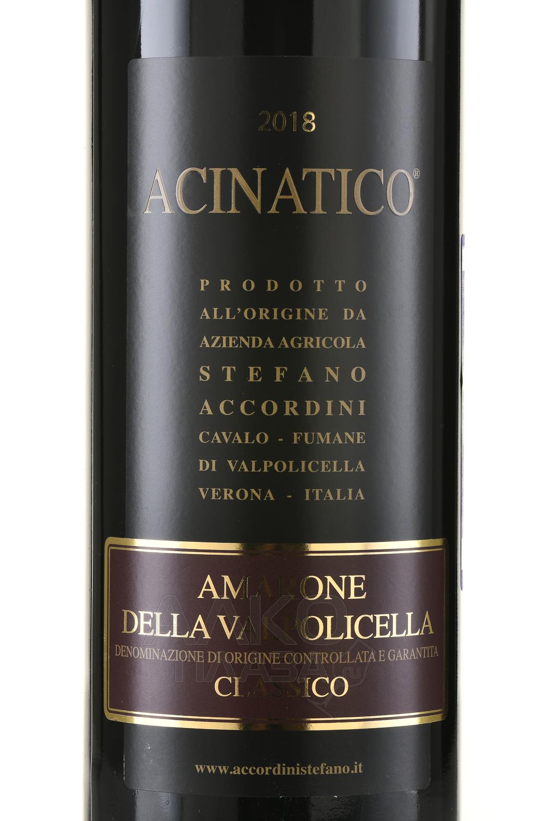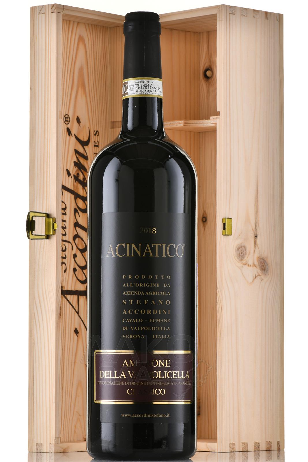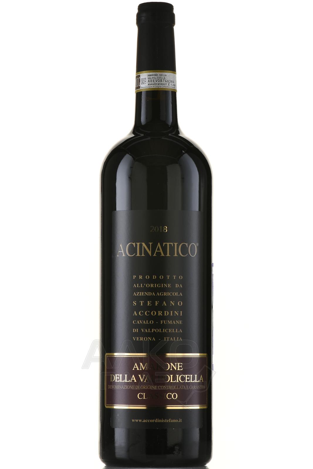 Красное сухое вино Acinatico Amarone della Valpolicella Classico 1.5 л – великолепный купаж популярных на севере Италии сортов винограда. Напиток производится по запатентованной технологии appassimento, которая предполагает предварительное подсушивание ягод на воздухе. Грозди, разложенные по 6 кг в открытые ящики, хранятся в специальном помещении, где естественным образом теряют влагу и насыщаются сахарами. Далее винификация идет традиционным путем – сусло ферментируется при контролируемой температуре и выдерживается в течение двух лет в дубовых барриках.