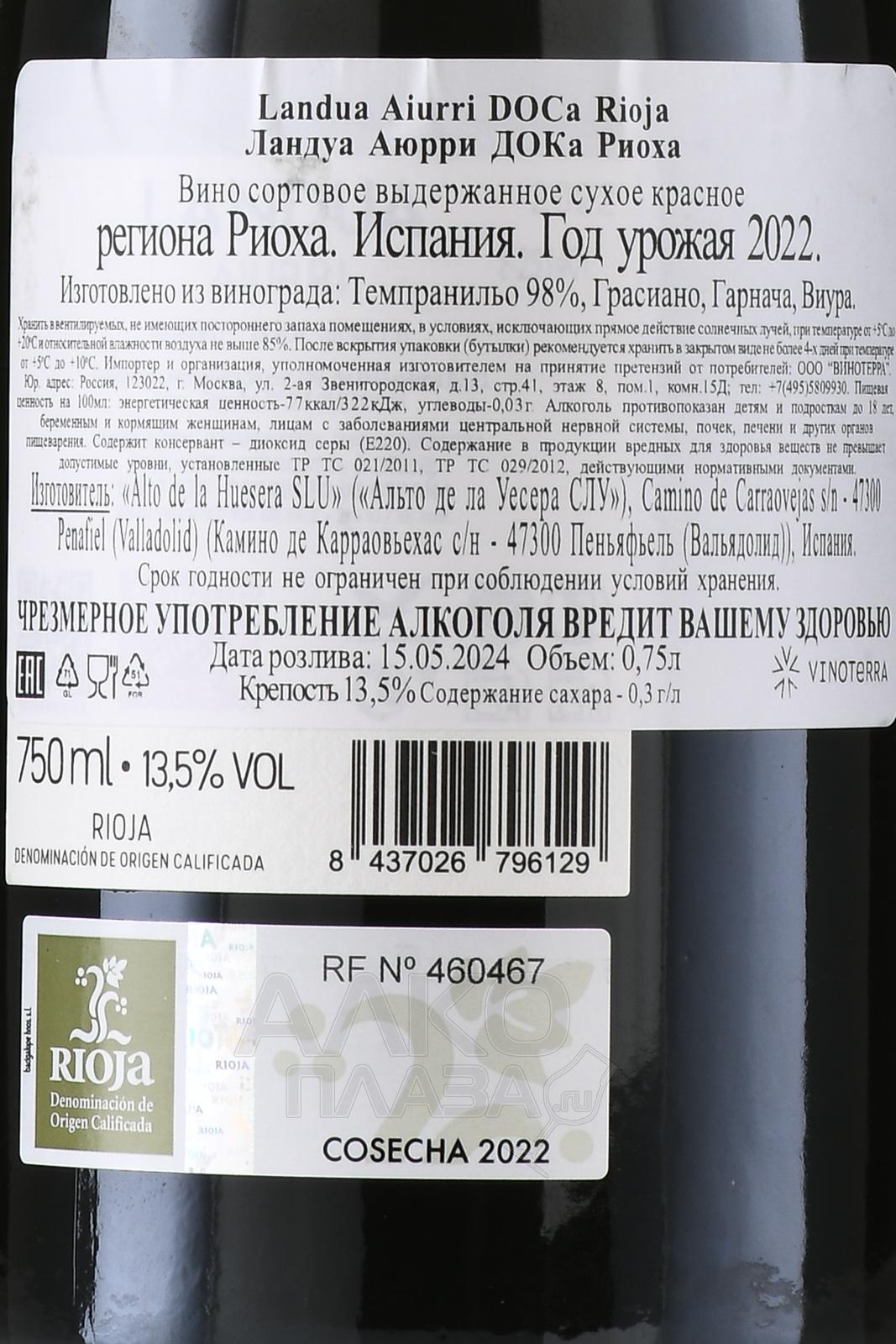 Красное сухое вино Aiurri Landua Rioja DOCa 0,75 л производится в одном из самых известных винодельческих регионов Испании — Риоха-Альта. Этот терруар славится прохладным климатом и известково-глинистыми почвами, которые придают ягодам плотность и свежую кислотность. Виноград выращивают на виноградниках, расположенных на высоте около 500 метров над уровнем моря, где колебания дневных и ночных температур помогают сохранить ароматический потенциал сорта. Производитель использует традиционные методы винификации с контролем температуры брожения и последующей выдержкой в дубовых бочках, в которых напиток формирует сбалансированный стиль и глубокий вкус.
