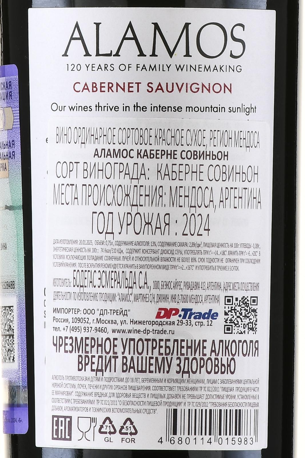 Красное сухое вино Alamos Cabernet Sauvignon подойдет на роль повседневного напитка. Виноград для его производства выращивается на большой высоте – от 800 до 1500 метров над уровнем моря, на участках Долины Уко в регионе Мендоса. Высокогорные районы характеризуются резкими перепадами дневных и ночных температур, что ведет к достижению ягодами оптимальных параметров спелости, кислотности и концентрации сахаров. Классическая технология винификации при контролируемой температуре и выдержка в дубовых бочках позволяют сохранить и развить великолепный букет спиртного.