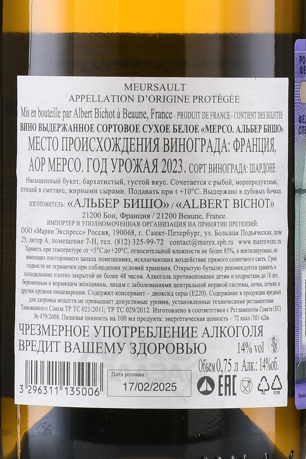Albert Bichot Meursault — белое сухое вино объёмом 0,75л коммунального апелласьона Мерсо, которое произведено крупным винным домом и негоциантом. Виноград для производства был собран с разных участков по всей территории коммуны. Отбор сырья строгий. Для винификации использовались бочки, сделанные из дуба разных французских лесов. Брожение протекало от 6 до 8 недель. Выдержка на протяжении 14-16 месяцев с проходящим в этот же период яблочно-молочным брожением.