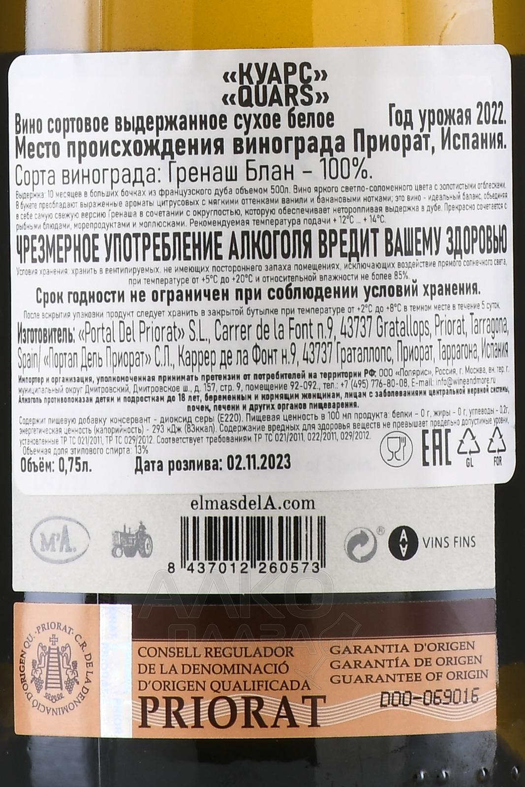 Белое сухое вино Alfredo Arribas Quars 0,75 л — точное выражение терруара горного Приората, где лозы сосредоточены на высотах 400–600 м над уровнем моря. Склоны сложены сланцем «ликорелла», который быстро прогревается и аккумулирует тепло, обеспечивая равномерное созревание ягод. Климат контрастный: жаркие дни сменяются прохладными ночами, что сохраняет свежесть и естественную кислотность будущего напитка. Урожай собирают вручную небольшими партиями, отбирая только здоровые грозди. Винификация проходит в бетонных и стальных емкостях с контролем температуры, а затем следует выдержка на осадке в 500-литровых французских бочках.