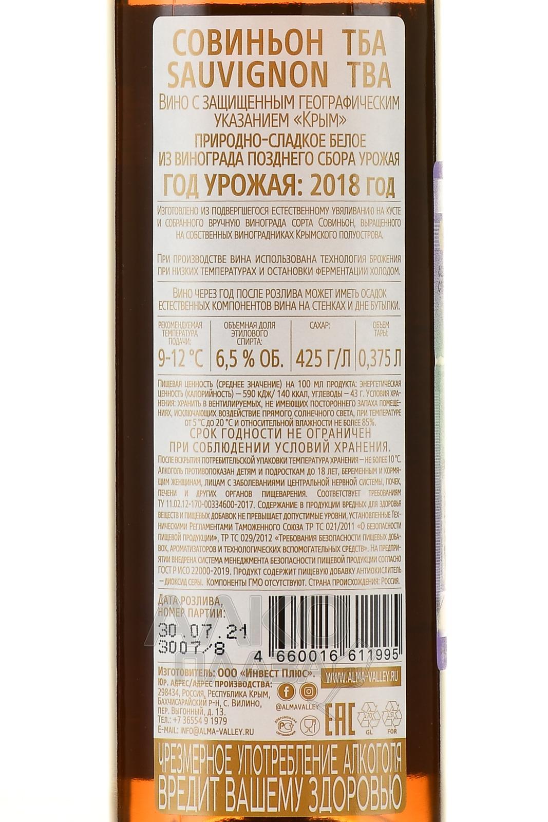 Alma Valley Sauvignon TBA — белое сладкое вино произведённое по технологии позднего сбора, подвергшегося ботритису винограда.