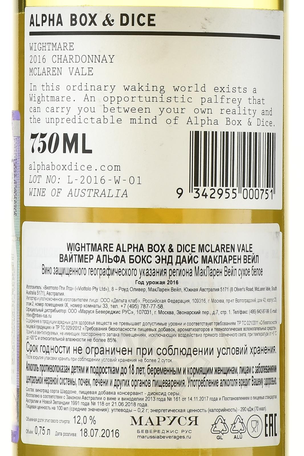 Белое сухое вино Alpha Box & Dice Wightmare Chardonnay 0,75 л производится австралийской винодельческой компанией из одноименного сорта светлого винограда, произрастающего на виноградниках в долине МакЛарен на известковых почвах. Сбор урожая осуществляется механическим способом, после чего ягоды сортируют и перерабатывают. После введения дрожжей сусло ферментируют в емкостях из нержавеющей стали. Выдержка на осадке с еженедельным перемешиванием длится около полугода. Этикетку вина украшает изображение мифической лошади.