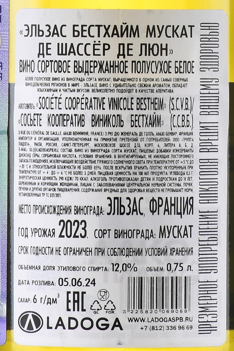 Белое полусухое вино Alsace Bestheim Muscat des Chasseurs de Lune 0,75 л — яркий представитель эльзасского виноделия с выразительным сортовым характером. Напиток производится из винограда, выращенного на солнечных склонах региона Эльзас на северо-востоке Франции. Лозы растут на высоте 200–400 метров над уровнем моря, преимущественно на известково-глинистых и гранитных почвах, которые хорошо удерживают тепло и влагу. Это позволяет ягодам равномерно созревать, сохраняя кислотность и ароматическую насыщенность. Виноград собирается вручную в начале сентября, благодаря чему сохраняет хрупкий мускатный аромат. Ферментация проходит при контролируемой температуре в стальных емкостях, без выдержки в дубе — это обеспечивает первозданную свежесть вина.