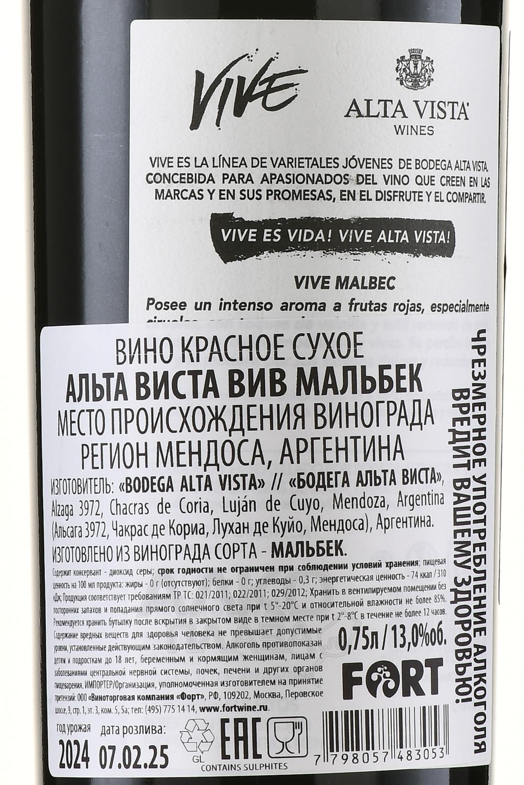 Красное сухое вино Alta Vista Vive Malbec 0,75 л представлено в серии молодых разновидностей, которую выпускает крупный аргентинский производитель. Этот напиток проходит минимальную выдержку и показывает весь свой потенциал в молодом возрасте. Он создается из одного сорта, который собирают вручную на виноградниках провинции Мендоса. Ягоды отделяют от веточек и прессуют, сок сбраживают в стальных чанах с помощью натуральных дрожжей при температуре 26-28 градусов. В этих же емкостях выдерживается 75% вина в течение полугода, а 25% дозревает в бочках из французского дуба.