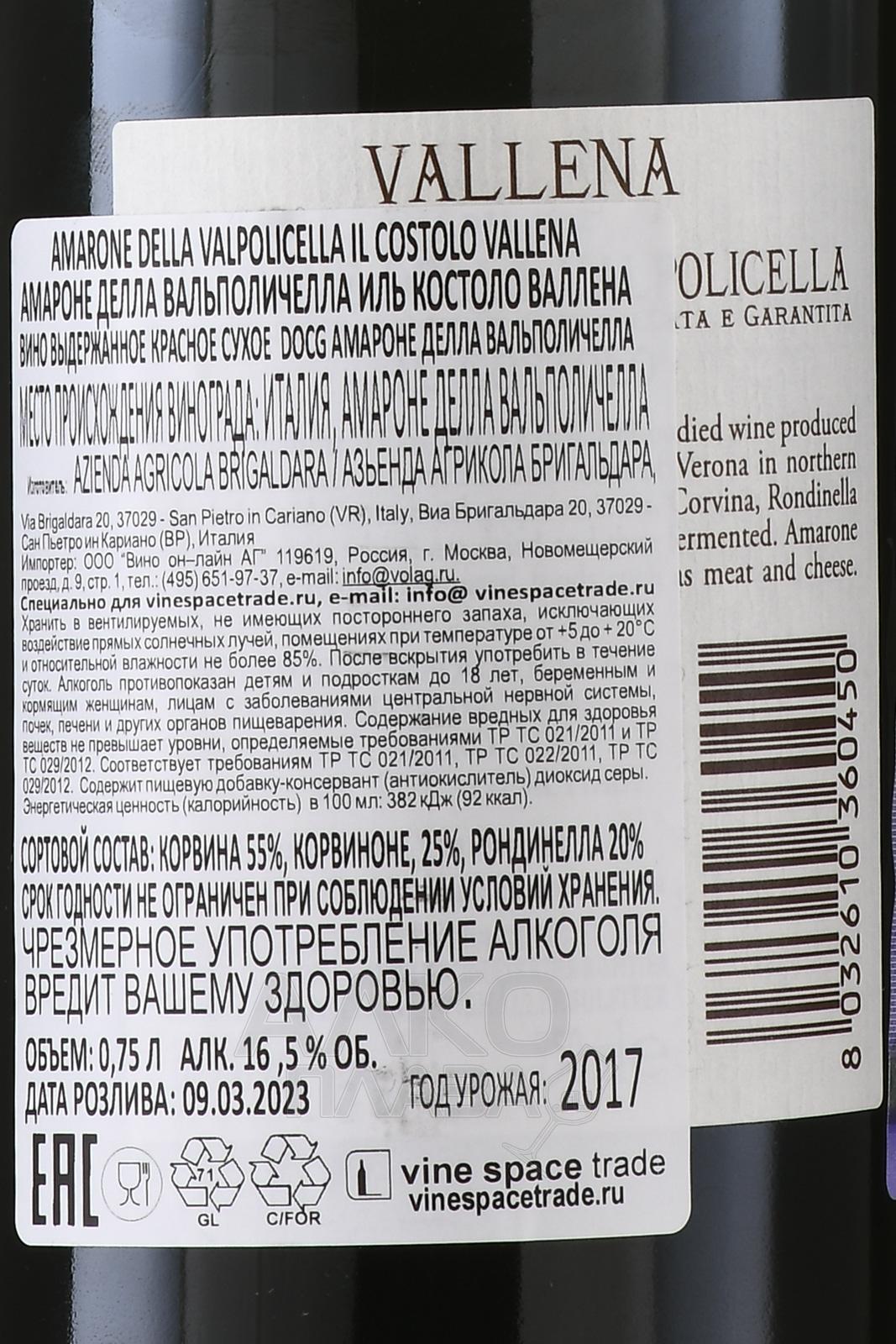 Красное сухое вино Amarone della Valpolicella DOCG Il Costolo 0,75 л — уникальное выражение винодельческой традиции Венето. Этот напиток создаётся из сортов Corvina, Corvinone и Rondinella. Виноград произрастает на участке Иль Костоло площадью около одного гектара, расположенном на высоте 250 м над уровнем моря с юго-западной экспозицией. В климате Вальполичеллы преобладает мягкий континентальный режим с умеренными температурами в период вегетации около +23,6 °C и годовым количеством осадков около 860 мм. Урожай собирают вручную в первой половине октября, затем ягоды сушат в течение примерно 100–120 дней, пока те не потеряют около половины первоначального веса. Этот метод под названием appassimento концентрирует вкусовые и ароматические вещества до насыщенного состояния. После прессования ферментация может длиться до 50 дней при низкой температуре, затем сусло выдерживают не менее двух лет в дубовых бочках.