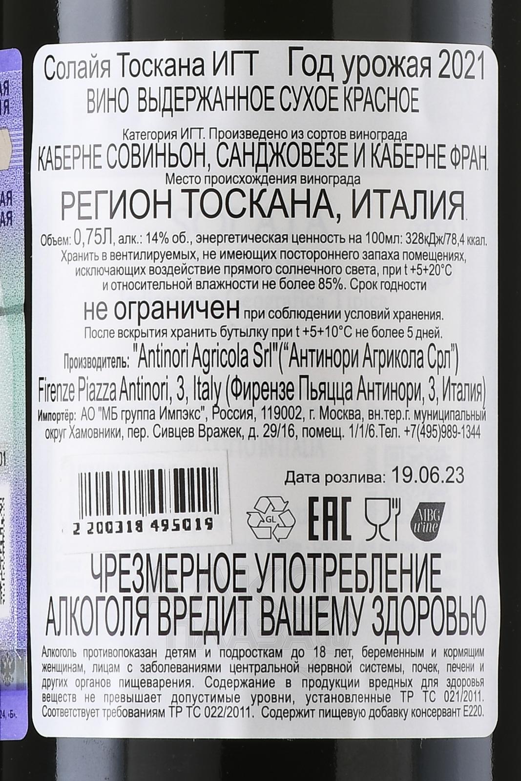 Красное сухое вино Antinori Solaia Toscana IGT 2021 г. 0,75 л — миллезим с исторического участка Тиньянелло, расположенного в холмистой зоне Кьянти Классико. Виноград произрастает здесь на высоте 350–400 м, где галестро и известняковые пласты формируют плотный, но дренированный терруар. Урожай собрали вручную при отличном состоянии ягод. На создание напитка пошли только тщательно отобранные грозди. Отделенные от стеблей плоды под силой гравитации переместили в конусообразные чаны объемом 60 гл и провели алкогольную ферментацию. Далее напиток перелили в баррики, где он прошел этап малолактики. Затем последовала 16-месячная выдержка во французском дубе. Партии сырья все это время винифицировались отдельно, а после их смешали и дали купажу отдохнуть еще некоторое время.