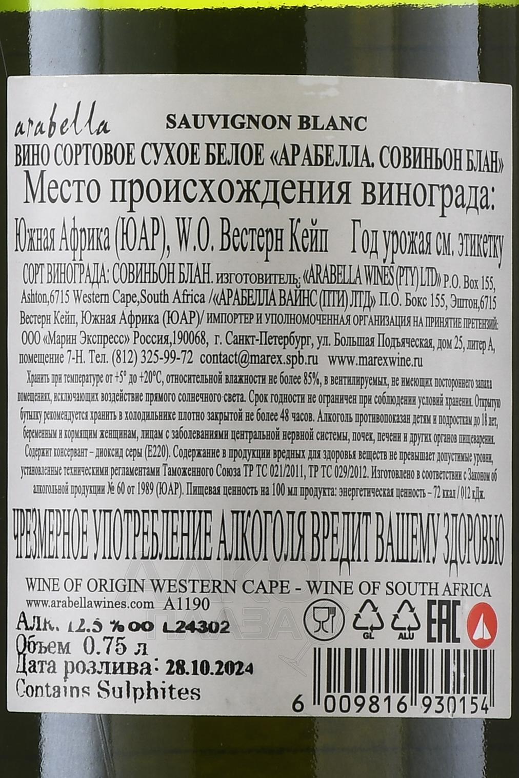 Arabella Sauvignon Blanc 0.75l – премиальное белое сухое вино из Южно-Африканской Республики, изготовленное семейным предприятием на базе ягод вариации Совиньон Блан.
