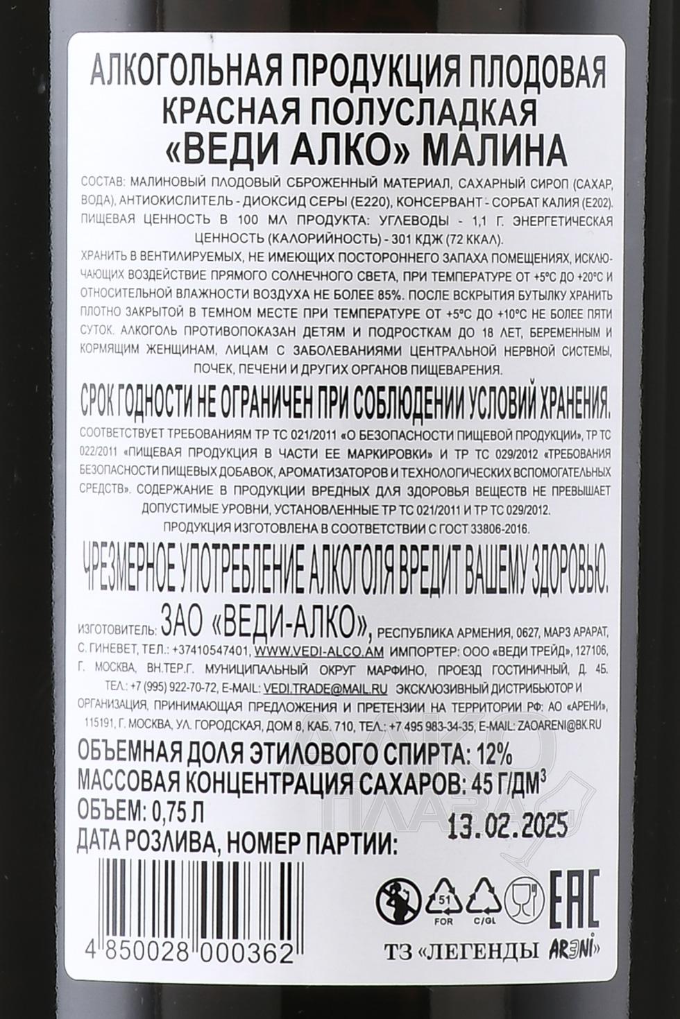 Vedi Alco Raspberry - вино Веди Алко Малина 0.75 л красное полусладкое