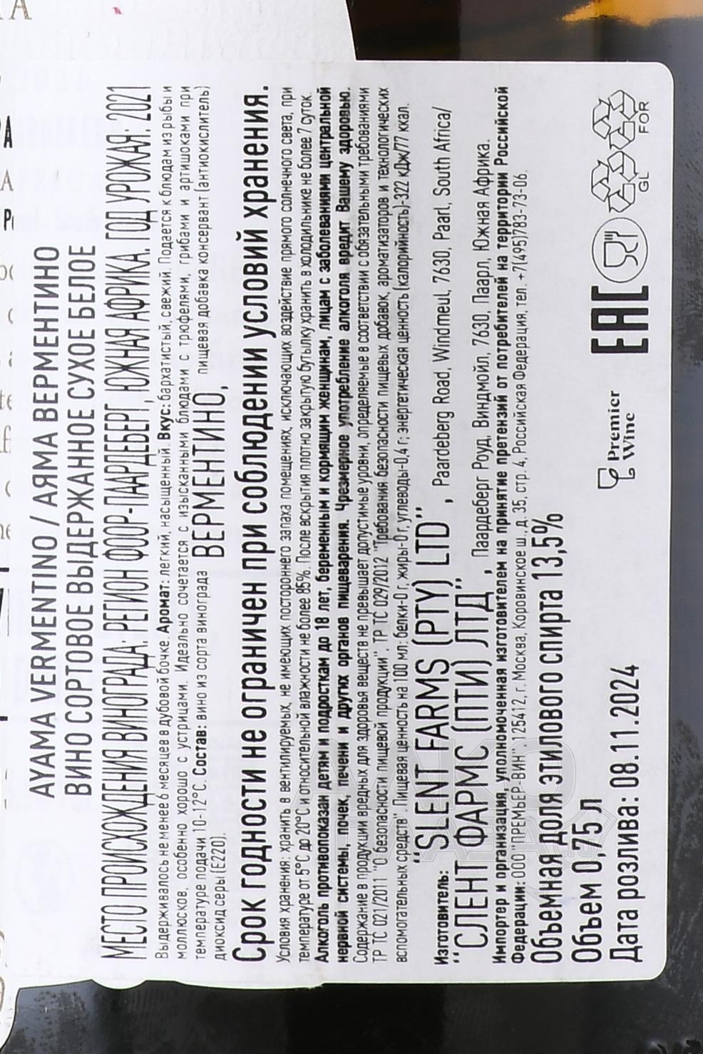 Белое сухое вино Ayama Vermentino 0,75 л производится в ЮАР из винограда, выращенного на склонах Паардеберга в регионе Свартланд. Этот терруар отличается гранитными и сланцевыми почвами, а также сухим средиземноморским климатом с прохладным влиянием океанских ветров. Такие условия позволяют сохранить естественную кислотность ягод и формируют сдержанный, чистый стиль. Сырьё собирают вручную при оптимальной спелости, прессуют, а отжатый сок сбраживают в стальных ёмкостях с контролем температуры и без последующей выдержки в дубе.