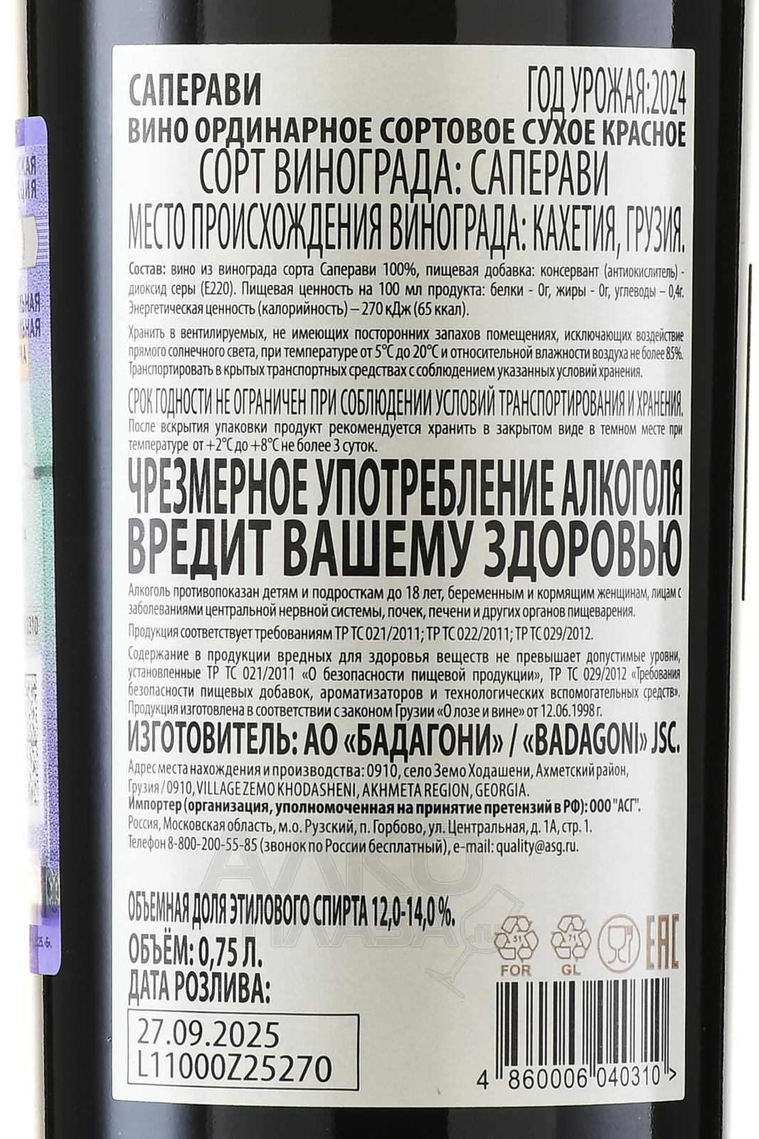 Производство: Винодельня Бадагони оснащенная современными технологиями дает возможность производить саперави с особыми вкусовыми свойствами и букетом. Брожение вина происходит в специальных резервуарах, которые оснащены режимом автоматического контроля температуры, что имеет решающее значение для выскокачественного произвоства вина. Рекоммендация: Особенно подходит к жареным блюдами из свинины, телятины и баранины.