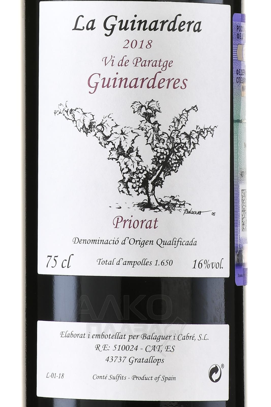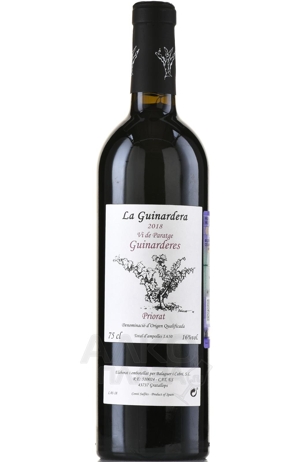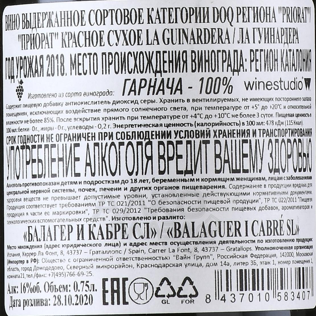 Красное сухое вино Balaguer I Cabre La Guinardera Priorat 0,75 л производится из винограда Гарнача, выращенного на небольшом участке площадью около 2 гектаров в поместье Ла Гуинардера. Виноградник расположен на вершине холма на высоте примерно 250 метров. Южная экспозиция обеспечивает интенсивное солнечное воздействие. Ягоды получают максимум тепла и полностью вызревают. Постоянное влияние ветров поддерживает здоровье лозы и концентрацию вкуса. Почвы типичны для Приората. Они содержат сланец и кварц, что усиливает минеральный характер вина. Сбор урожая проводится вручную. Ферментация проходит с контролем температуры для сохранения сортовых особенностей. Затем вино выдерживают 12 месяцев в французских дубовых бочках объёмом 500 литров, которые уже использовались ранее. После розлива следует длительное бутылочное созревание около 30 месяцев. Вино выпускается ограниченным тиражом и рассматривается как выражение конкретного виноградника.