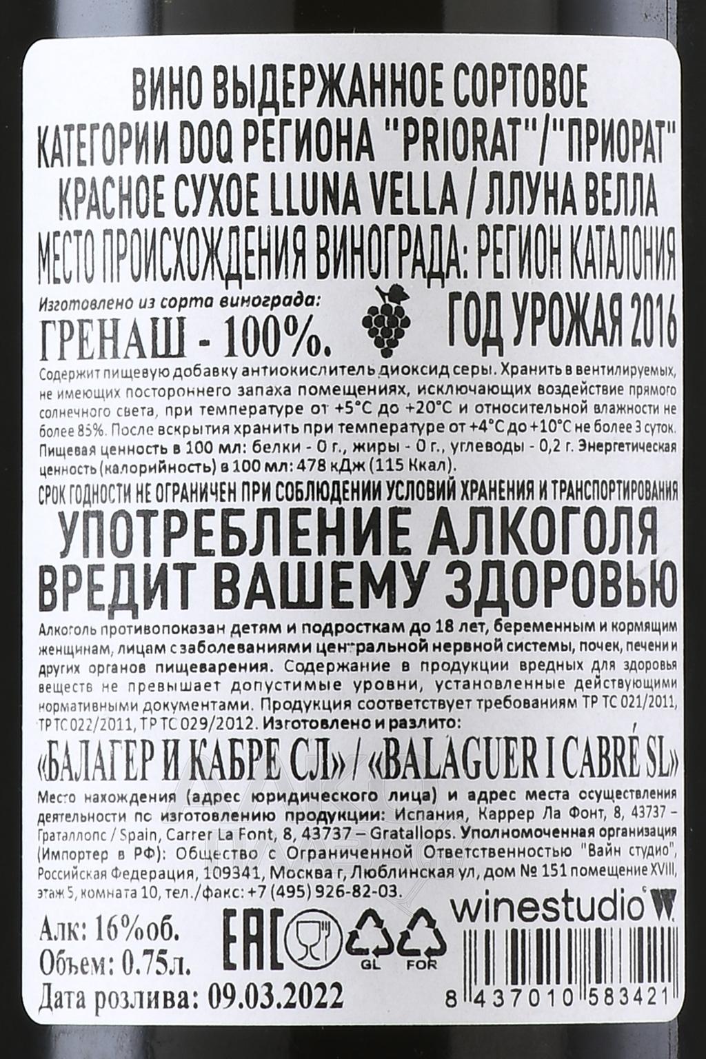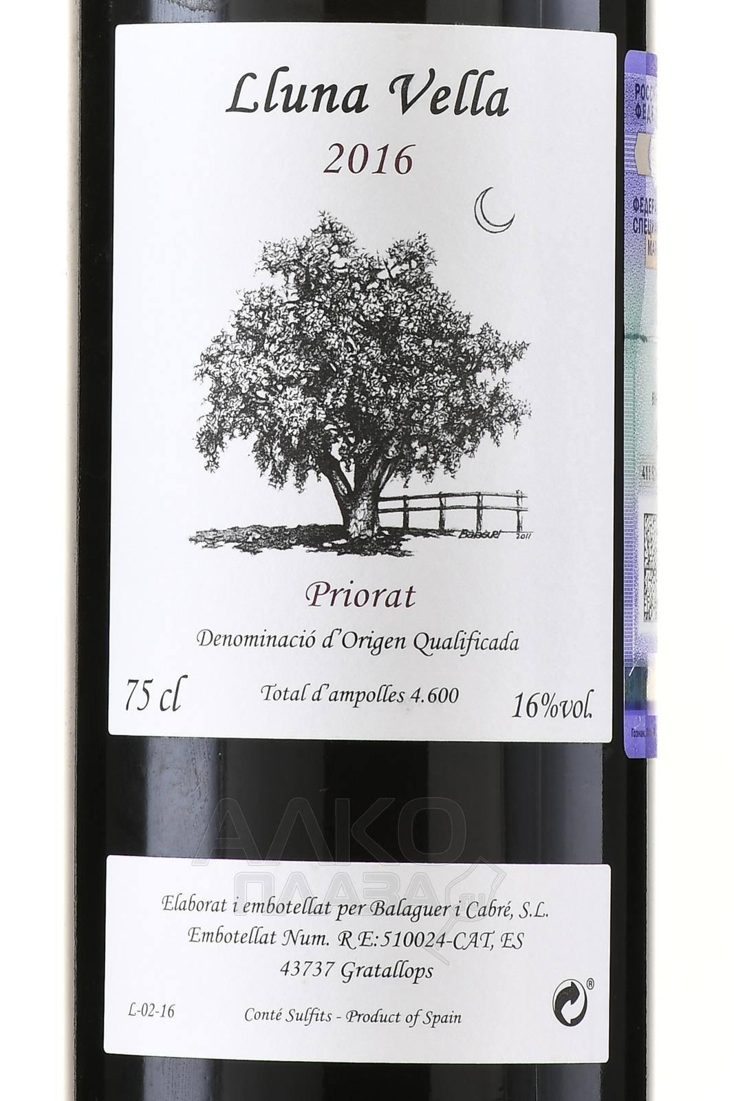 Красное сухое вино Celler Balaguer i Cabre Lluna Vella 0,75 л создано в испанском регионе Приорат из сорта Гарнача. Сырье поступает с отдельного виноградника под названием Мас де Дальта. Лозы растут на высоте более 400-500 метров в прохладном климате на плотных почвах. Винификация осуществляется в рамках традиционной методики, затем вино проходит выдержку в бочках объемом 500 мл на протяжении года. После розлива оно еще 20 месяцев развивается в бутылках.