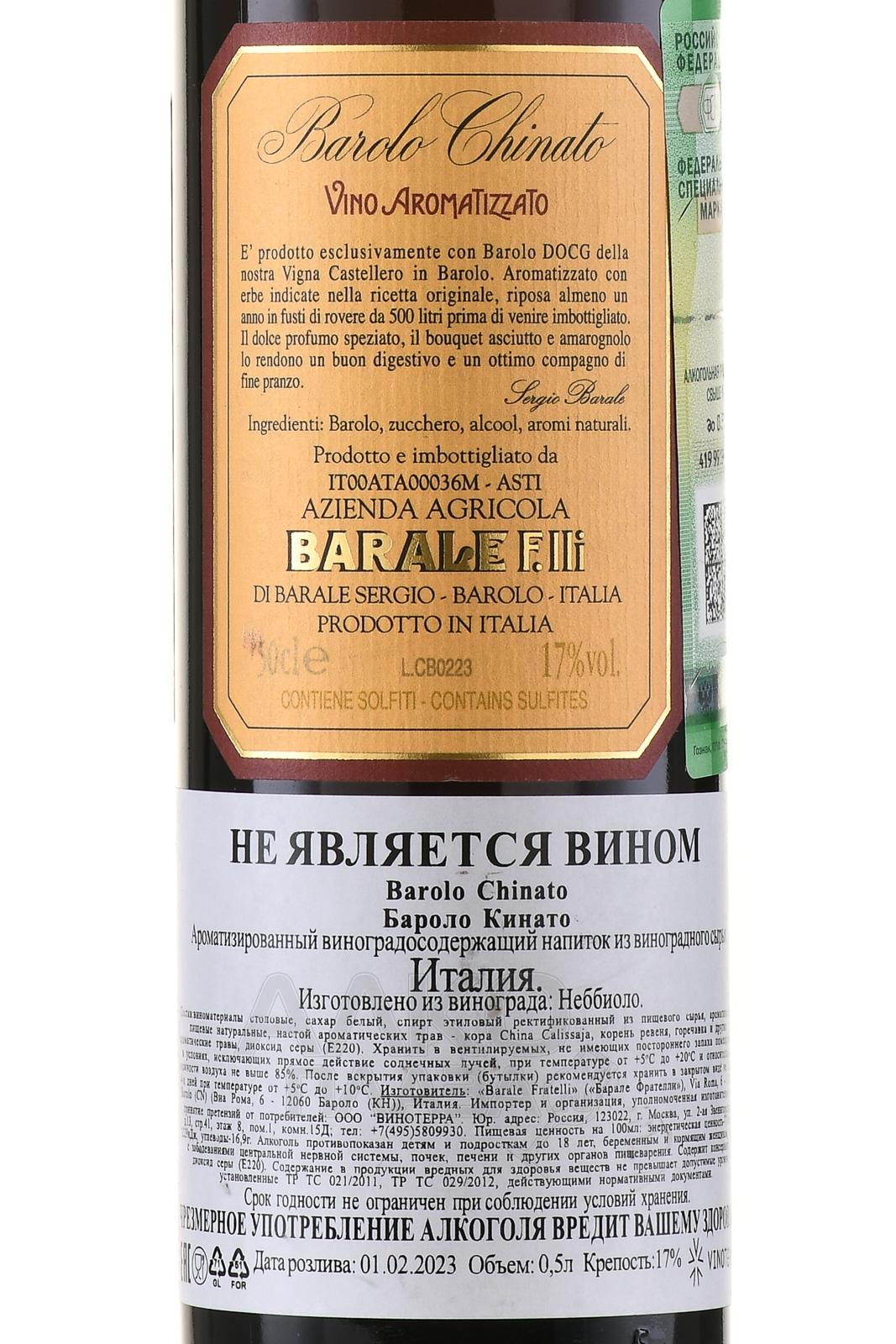 Barale Fratelli Barolo Chinato 0,5 л – это мягкий и насыщенный крепленый напиток на основе классического красного вина Бароло. Он создается из выдержанного винограда сортов Неббиоло, выращенного в культовой винодельческой зоне в Пьемонте. Местный терруар характеризуется меловыми и известняковыми почвами, обеспечивающими тонкий и устойчивый профиль винограда. Климат здесь умеренно теплый, с дневными температурами в диапазоне +25…+30 °C, значительными суточными амплитудами и осадками около 600 мм, что обеспечивает высокий уровень концентрации фенолов. После традиционной ферментации производится настаивание на коре хинного дерева и ароматных травах. Затем купаж выдерживается в дубовых бочках до достижения баланса вкуса и аромата.