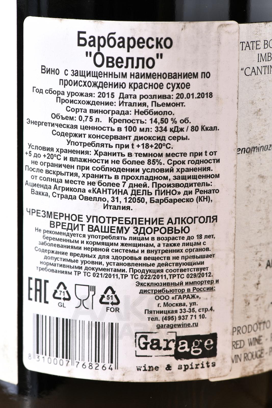 Barbaresco Ovello Cantina del Pino - вино Барбареско Овелло Кантина дель Пино 0.75 л красное сухое