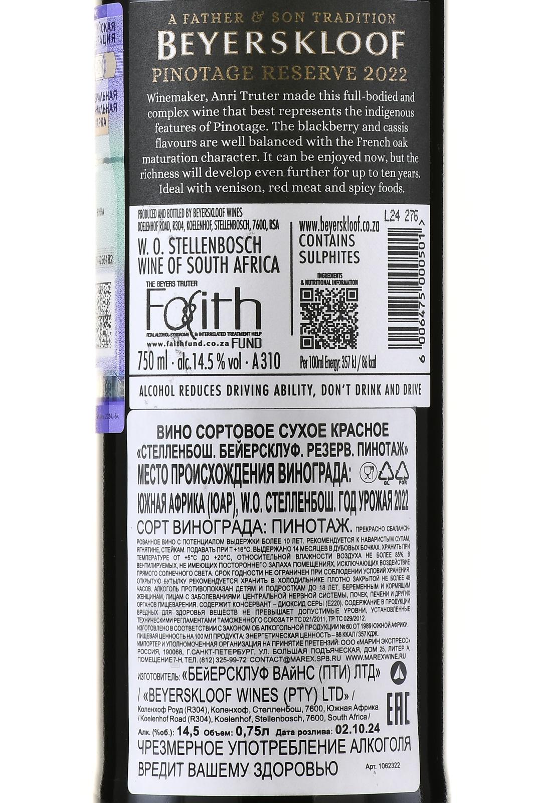 Красное сухое вино Beyerskloof Reserve Pinotage 0,75 л производится в регионе Стелленбош. Винодельня расположена в зоне Кёленхоф, где виноградники залегают на склонах с почвами на основе разложившегося гранита и песчаника. Такие грунты хорошо удерживают тепло и при этом обеспечивают дренаж, что способствует равномерному созреванию ягод. Климат здесь тёплый, с умеренным влиянием океанических воздушных потоков, которые смягчают жару и сохраняют кислотность. Виноград отбирается с участков, где лозы посажены более 20 лет назад. Брожение проходит на протяжении 4–5 дней в открытых ферментёрах с контролем температуры в пределах 25–28 °С. Далее следует малолактика и выдержка в дубе, в бочках второго и третьего наполнения в течение 14 месяцев.