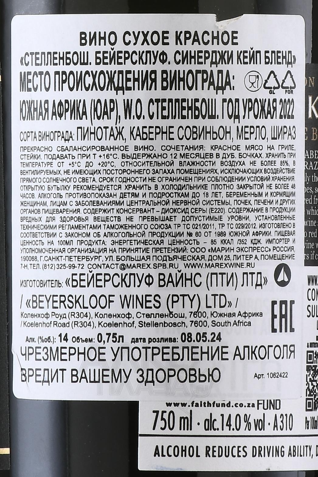 Красное сухое вино Beyerskloof Synergy Cape Blend 0,75 л производится в ЮАР, в регионе Стелленбош. Виноградники находятся в зоне с тёплым средиземноморским климатом, где лето — сухое, а ночи — прохладнее благодаря океанскому влиянию. Почвы — преимущественно гранитные и разложившиеся сланцы, что обеспечивает хороший дренаж и умеренный стресс для лозы. Эти условия способствуют концентрации вкуса и формированию плотной структуры. Купаж отражает местные традиции купажирования, где ключевую роль играет Пинотаж в сочетании с классическими международными сортами. Винификация проводится раздельно для каждого компонента. Ферментация проходит в стальных чанах. После смешивания вино выдерживается в дубовых бочках, часть из которых ранее использовалась, что позволяет сохранить баланс между фруктовой основой и влиянием древесины.