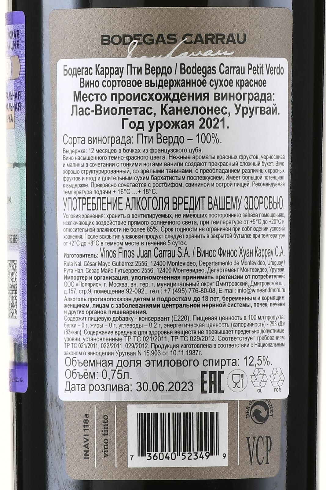 Красное сухое вино Bodegas Carrau Petit Verdot 0,75 л создано в Уругвае из винограда, выращенного в зоне Las Violetas региона Канелонес. Участки расположены на почвах с хорошим дренажом, что способствует равномерному созреванию позднего сорта. Сбор проводится вручную. Ягоды проходят сортировку на винодельне. Ферментация осуществляется в ёмкостях с контролем температуры для сохранения сортового профиля. Дальнейшее развитие напитка проходит с участием дубовой выдержки, которая подчёркивает структуру и глубину, не подавляя фруктовую основу.