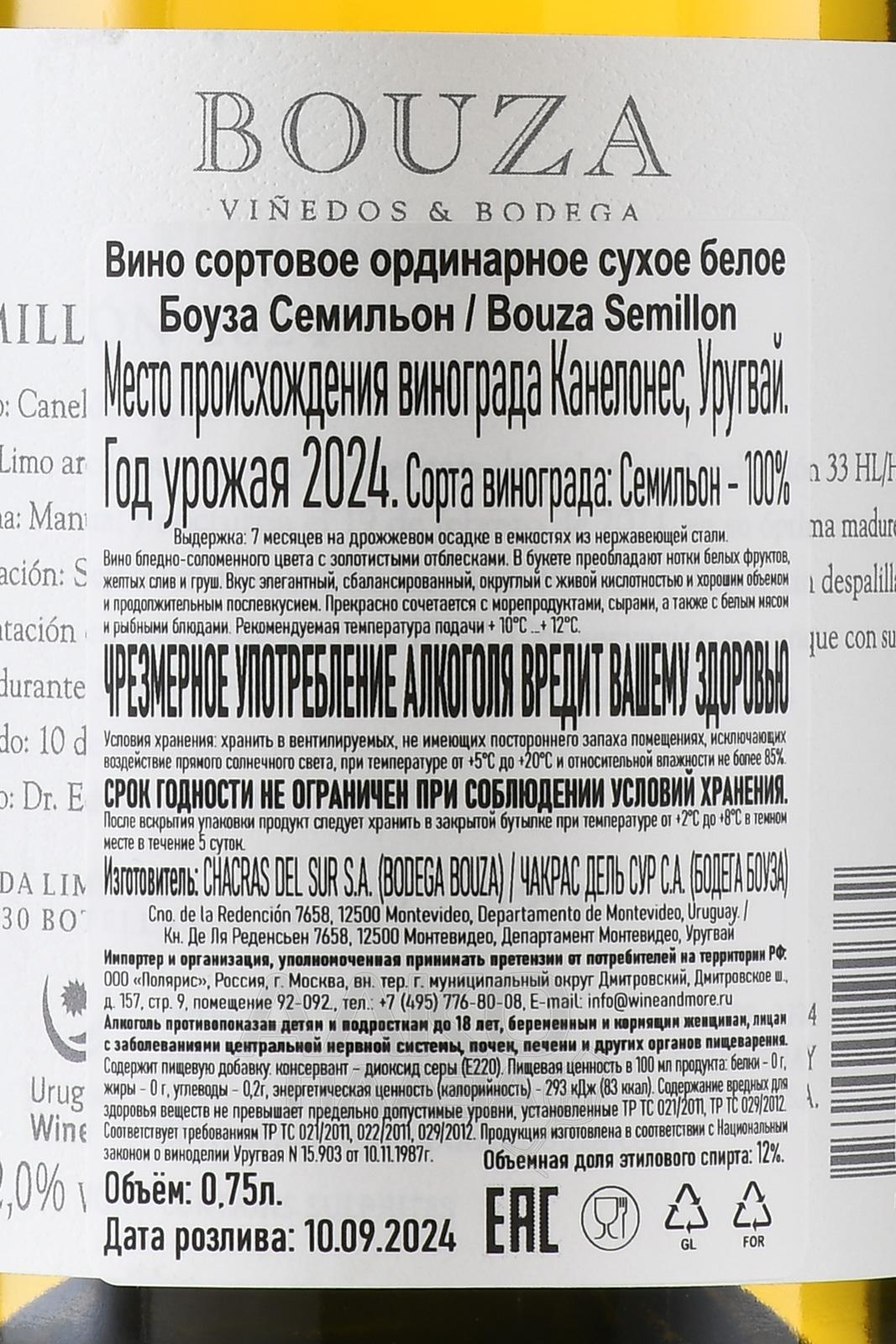 Белое сухое вино Bouza Semillon 0,75 л производится в Уругвае из винограда, выращенного на виноградниках хозяйства в регионе Канелонес. Лозы высажены на глинисто-известковых почвах, которые способствуют сохранению кислотности и точному выражению сорта. Виноград собирают вручную при оптимальной зрелости. После мягкого прессования сусло ферментируется с контролем температуры. По данным производителя, часть объёма проходит выдержку в дубовых бочках с последующим контактом с тонким осадком, что усиливает текстуру и добавляет вкусовую глубину. Стиль ориентирован на чистоту сорта, баланс и гастрономичность, без избыточной тяжести.