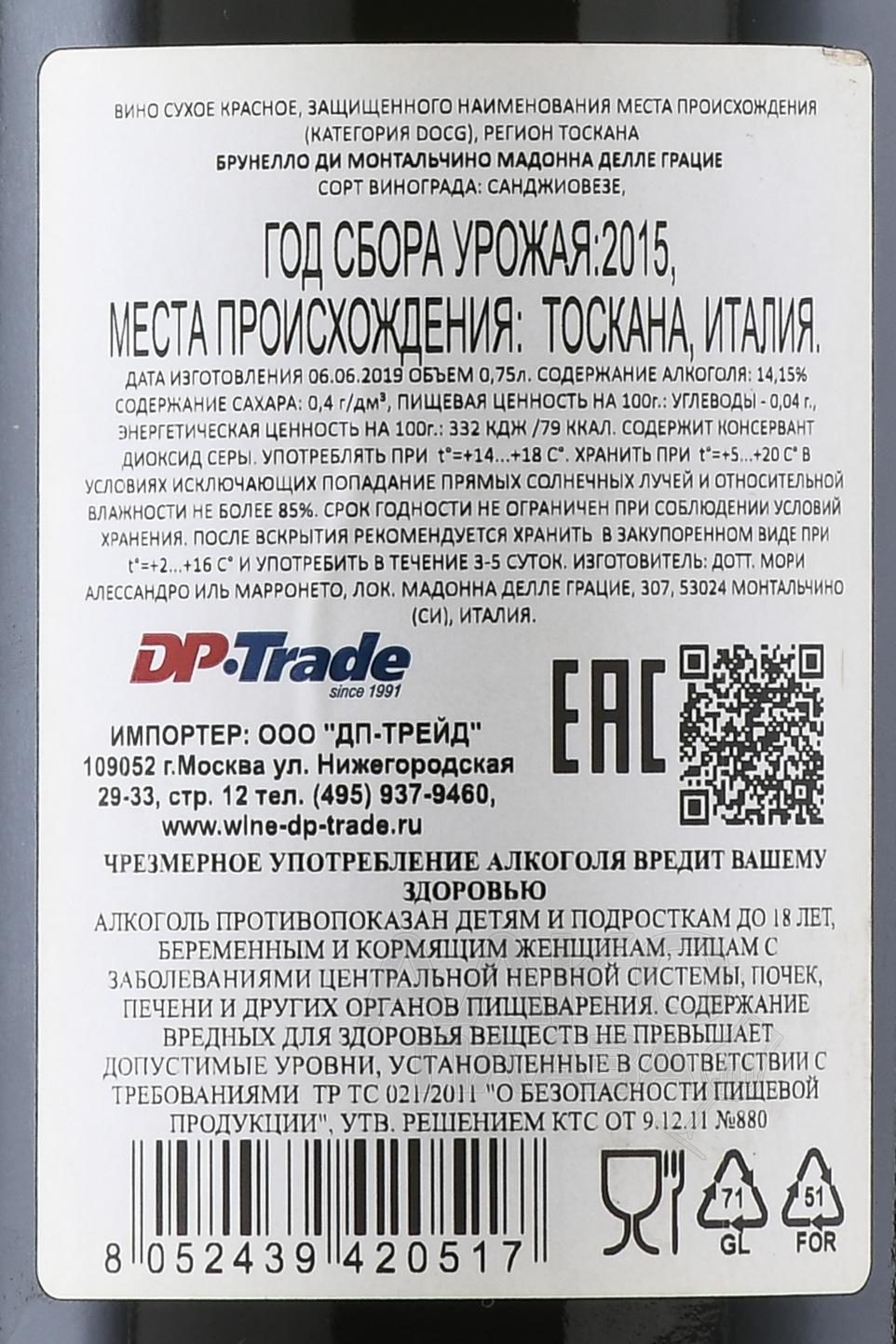 Вино Brunello di Montalcino Madonna delle Grazie 0.75 l – это красный сухой алкоголь, который производится в регионе Монтальчино в южной части Тосканы (Италия). Он имеет очень богатую историю, восходящую к 14 веку. Производство вина начинается с ручного сбора винограда сорта Санджовезе, произрастающего на юго-западных склонах холмов Монтальчино, отличающихся большой высотой и прохладной температурой. На винодельне ягоды тщательно сортируются и подвергаются мягкому прессованию. Полученное сусло помещается в чаны из нержавеющей стали для ферментации. На этом этапе особое внимание уделяется контролю температуры и длительности брожения. Далее вино выдерживается не менее 4-х лет в дубовых бочках и еще 6 месяцев в бутылках. Этот период является ключевым для формирования неповторимого характера Брунелло ди Монтальчино