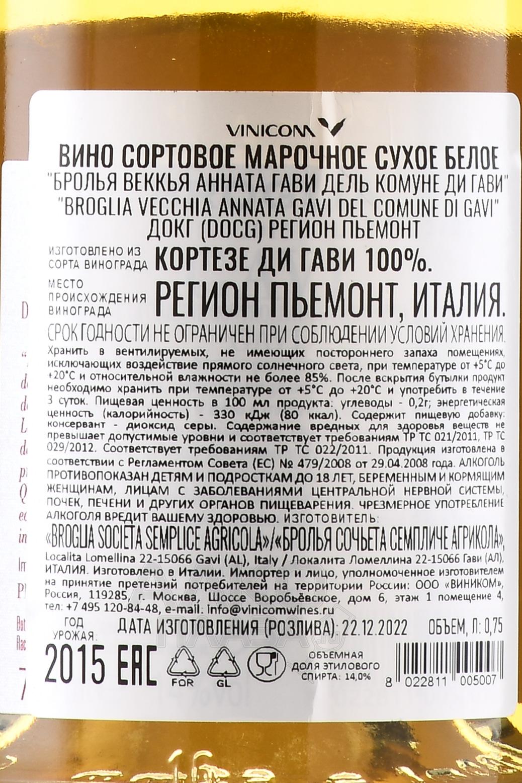 Белое сухое вино Broglia Gavi Vecchia Annata Gavi del Comune di Gavi 0,75 л - является данью памяти основателю винодельни Бруно Бролья. Виноград собирается с лоз которые высадил сам Бруно в 53-55 годах 20 века, и только ручным способом. После сбора виноград отправляется на винодельню где он проходит последующие процессы прессования и ферментации под строгим контролем. Созревает вино на протяжении полугода в стальных чанах.