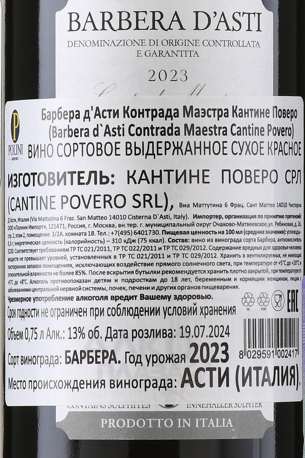 Вино Cantine Povero Barbera d`Asti Contrada Maestra 0.75 л — представитель винодельческих традиций Пьемонта, воплощающий характер региона Асти и мастерство семейного хозяйства Cantine Povero. Напиток создаётся из тщательно отобранного винограда, собранного вручную на холмистых участках с известняково-глинистыми почвами, обогащёнными минералами. Умеренный континентальный климат с ярко выраженными суточными перепадами температур способствует медленному созреванию ягод, что придаёт напитку глубину вкуса и ароматическую насыщенность. Ферментация проводится в стальных резервуарах при контролируемой температуре, а выдержка осуществляется в дубовых бочках, где напиток приобретает гармонию, мягкость и сложную структуру с лёгкими древесными оттенками. Каждая бутылка — результат сочетания природного потенциала терруара и многолетнего опыта виноделов, создающих продукт с яркой индивидуальностью и благородным характером.
