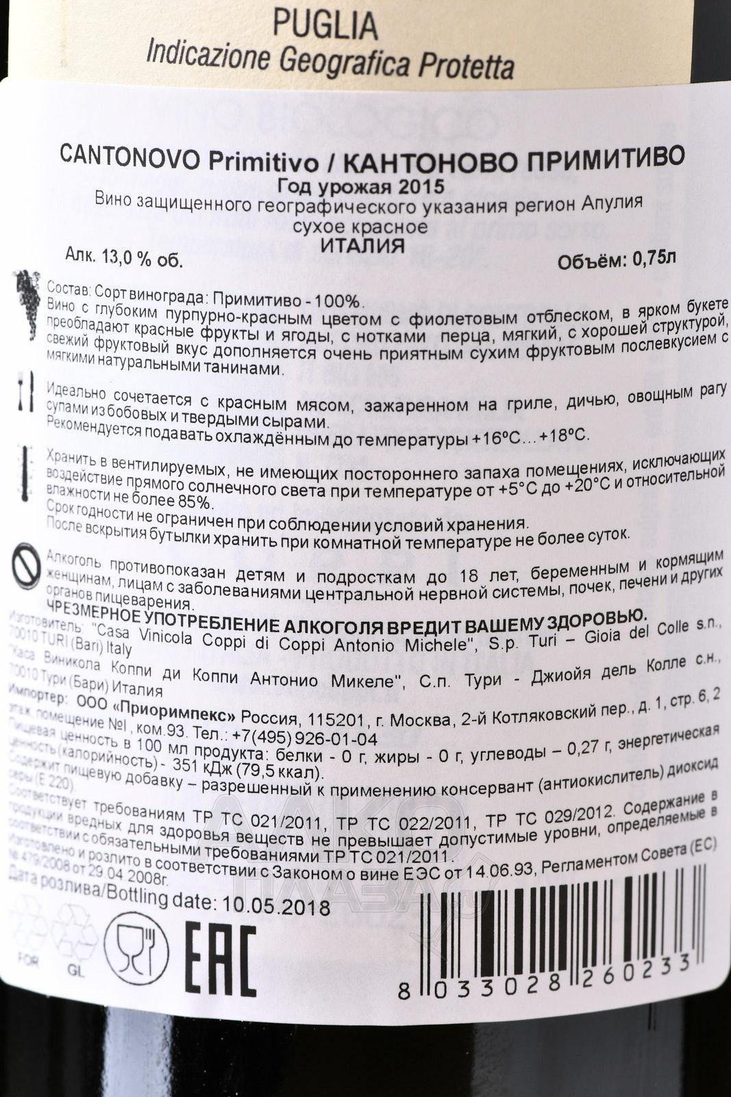 Cantonovo Primitivo - вино Кантоново Примитиво 0.75 л красное сухое